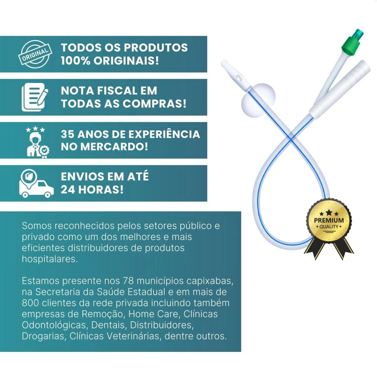 Desde 1990 atuamos com foco em licitações públicas para atendimento a hospitais e clínicas médicas do ES. Somos reconhecidos pelos setores público e privado como um dos melhores e mais eficientes distribuidores de produtos hospitalares. Estamos presentes nos 78 municípios capixabas, na Secretaria da saúde Estadual e em mais de 800 clientes da rede privada, incluindo empresas de Remoção, Home Care, Clínicas Odontológicas, Dentais, Distribuidores, Drogarias, Clínicas Veterinárias, dentre outros.