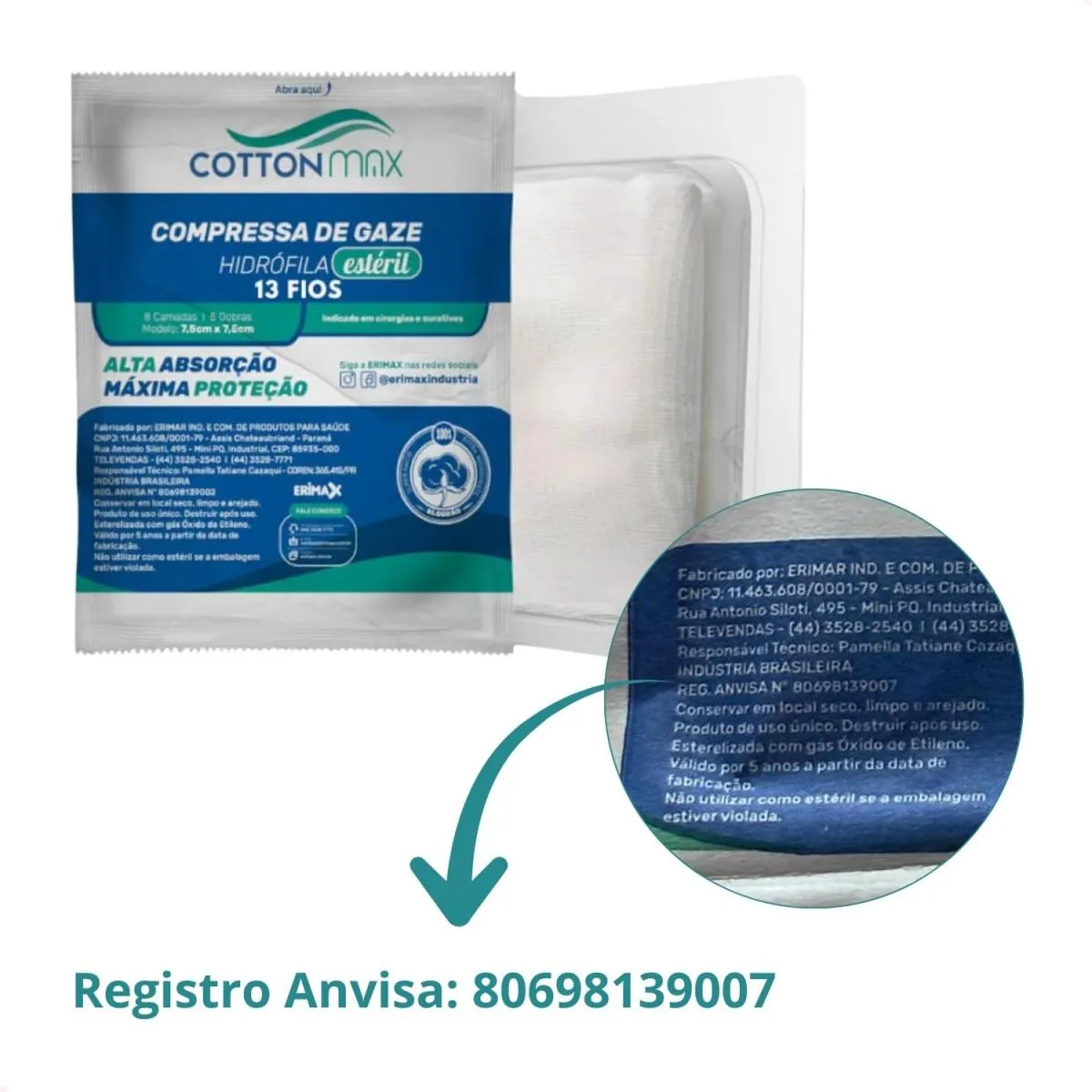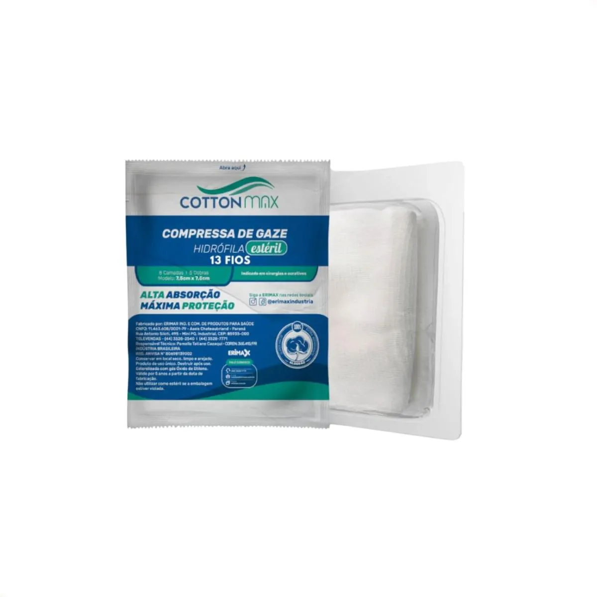 A Compressa de Gaze Cotton Max da Erimax é desenvolvida com tecido 100% algodão, oferecendo alta capacidade de absorção, maciez e segurança no contato com a pele. Indicada para limpeza, proteção, absorção de sangue e exsudatos, além de cobertura de curativos e antissepsia em procedimentos invasivos.