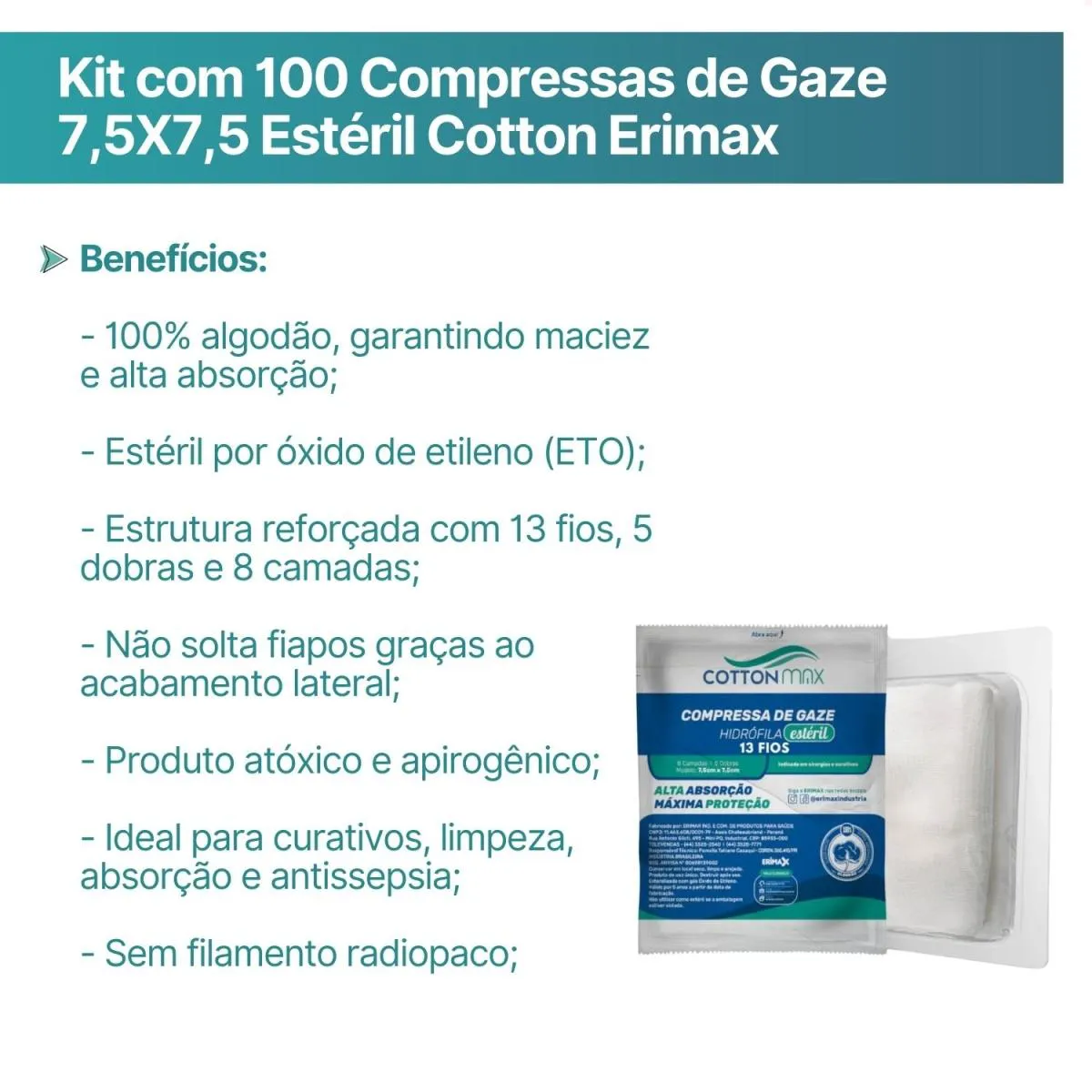 Kit com 100 Compressas de Gaze 7,5X7,5 Estéril Cotton Erimax (100 pacotes com 10 unidades cada)