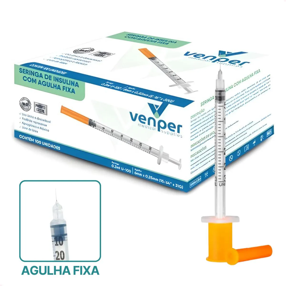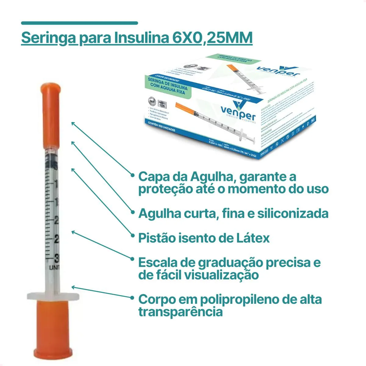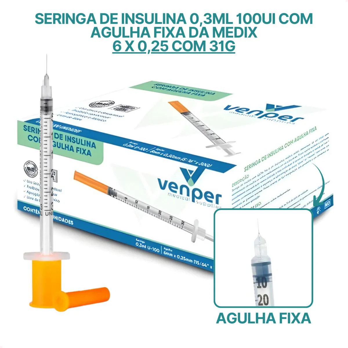 Produto: Agulha fixa 6x0,25 30G 100UI 0,3ml;