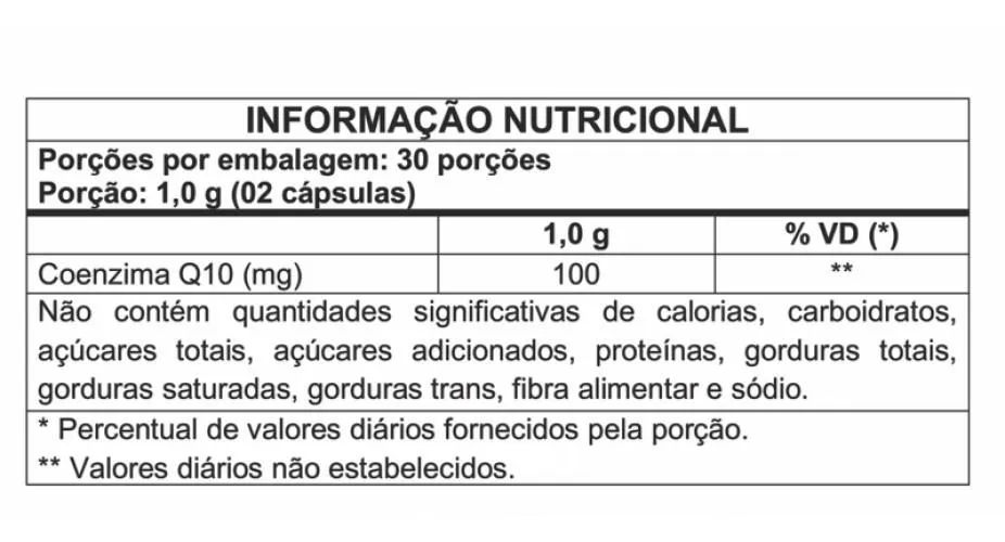 INGREDIENTES: -Coenzima Q10, Silicato de magnésio. Composição da cápsula gelatina, umectante glicerina e corante dióxido de titânio NÃO CONTÉM GLÚTEN.