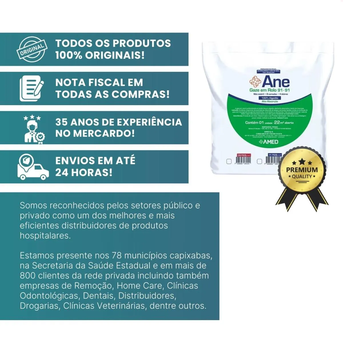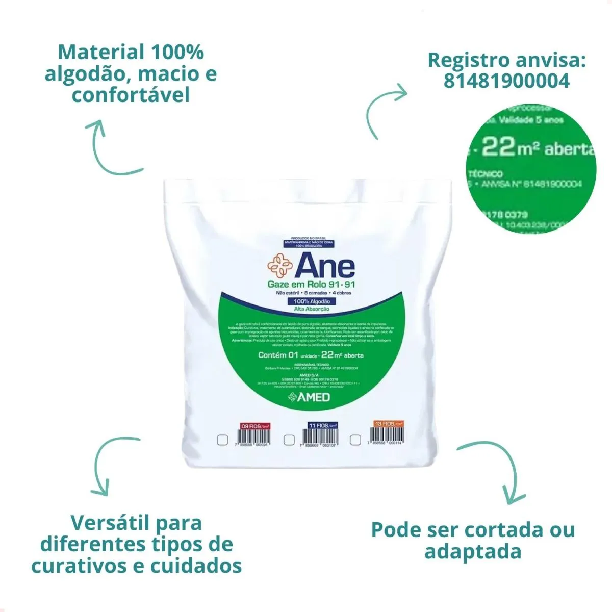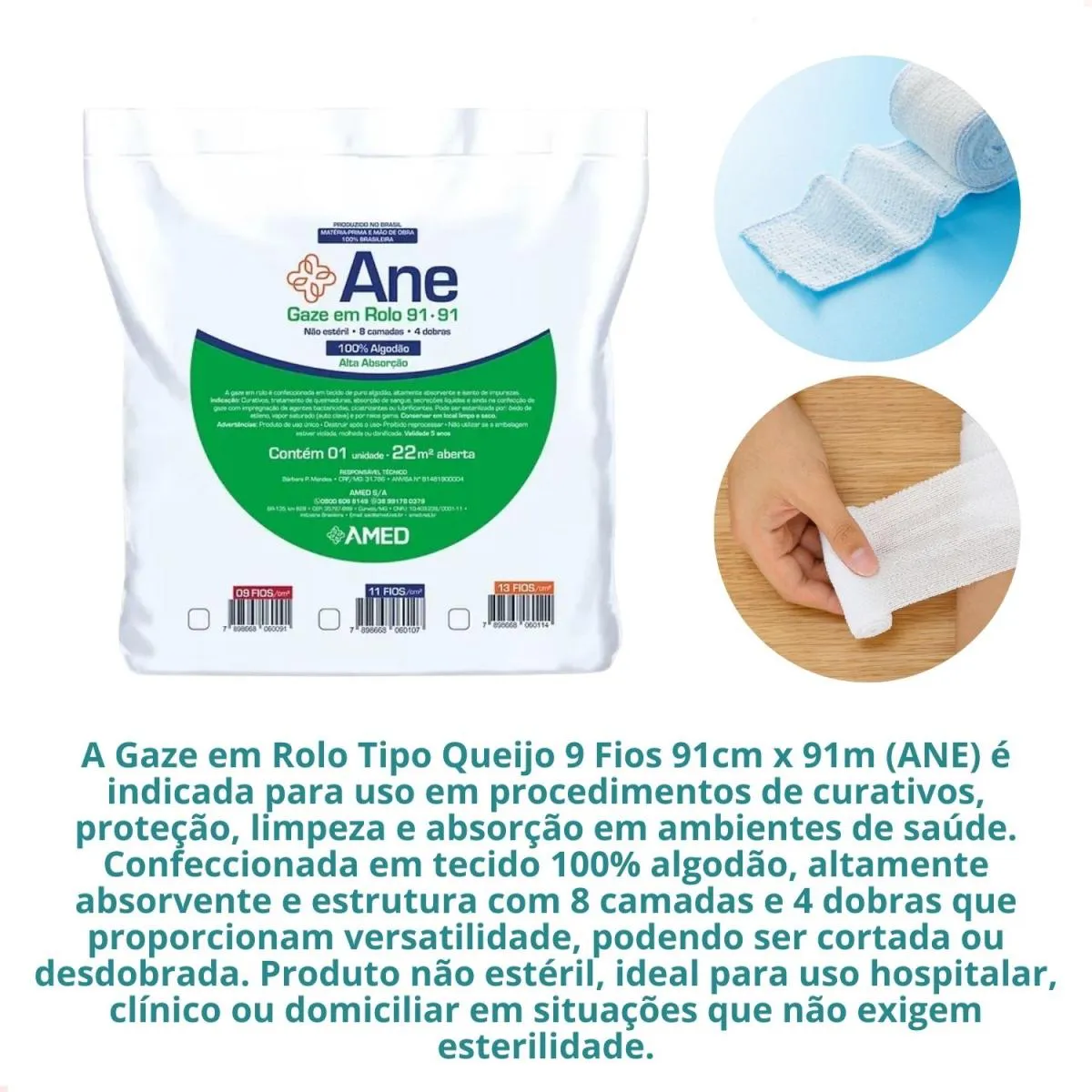 A Gaze em Rolo Tipo Queijo 9 Fios 91cm x 91m (ANE) é indicada para uso em procedimentos de curativos, proteção, limpeza e absorção em ambientes de saúde. Confeccionada em tecido 100% algodão, possui baixa densidade de fios por centímetro quadrado, sendo altamente absorvente. Sua estrutura com 8 camadas e 4 dobras proporciona versatilidade, podendo ser cortada ou desdobrada. Produto não estéril, ideal para uso hospitalar, clínico ou domiciliar em situações que não exigem esterilidade.