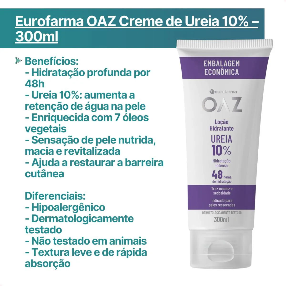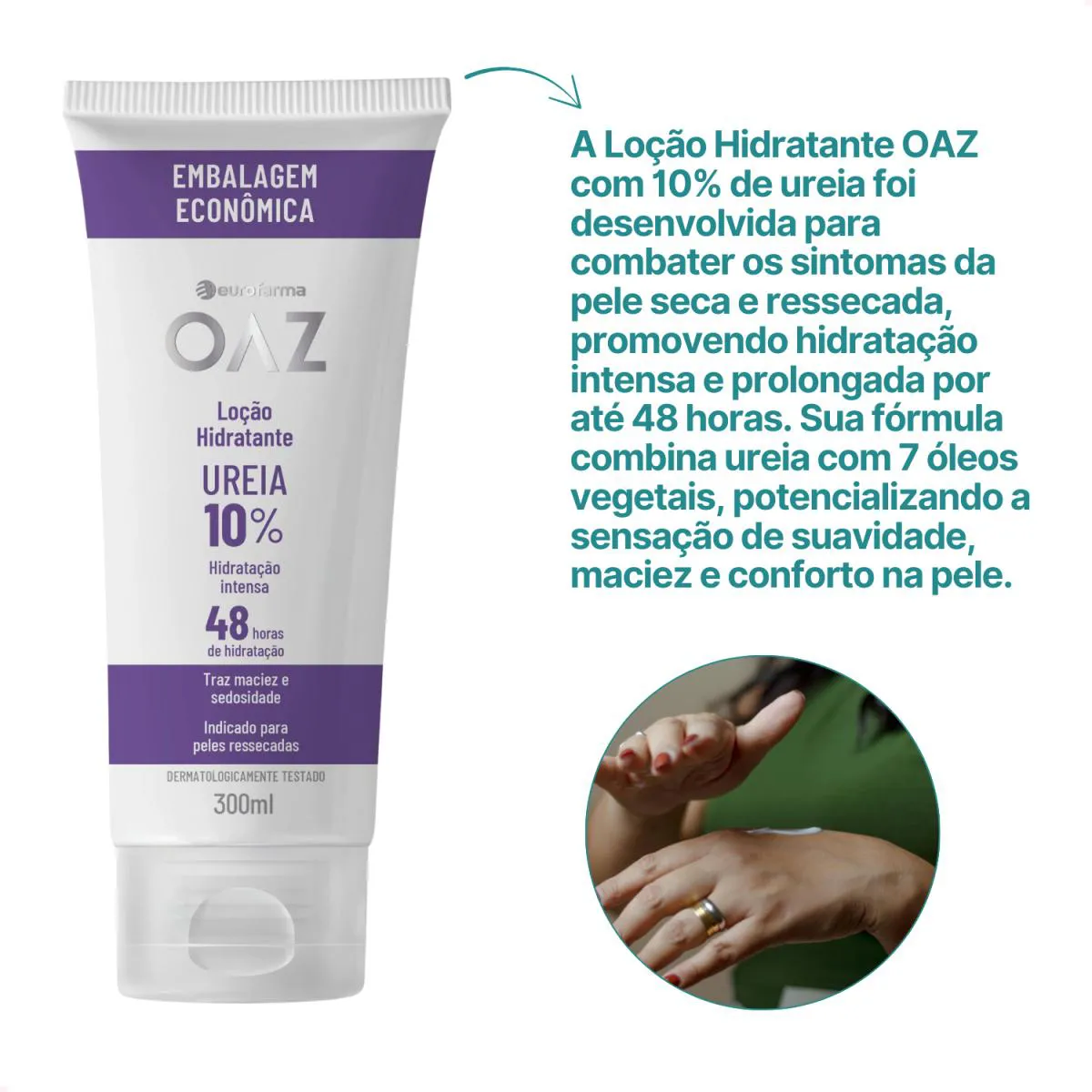 A Loção Hidratante OAZ com 10% de ureia foi desenvolvida para combater os sintomas da pele seca e ressecada, promovendo hidratação intensa e prolongada por até 48 horas. Sua fórmula combina ureia com 7 óleos vegetais, potencializando a sensação de suavidade, maciez e conforto na pele.