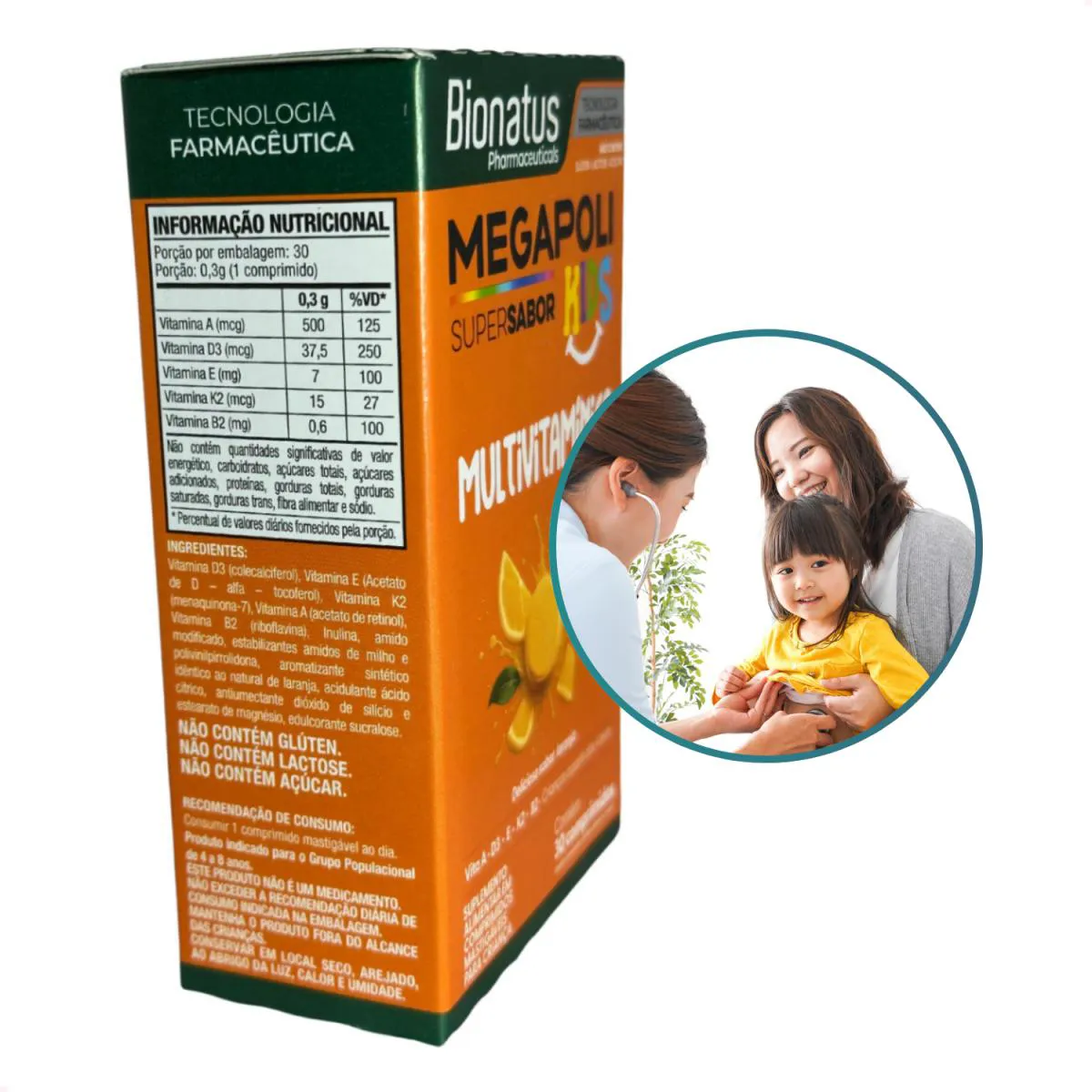 Com sabor laranja irresistível, o Megapoli Kids vem em comprimidos mastigáveis, tornando o consumo muito mais prático e agradável ? não há necessidade de água. É ideal para facilitar a rotina dos pais, garantindo nutrição com muito mais sabor.