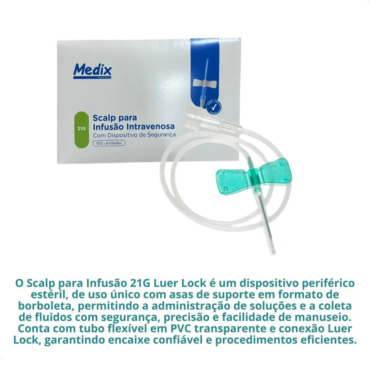 O Scalp para Infusão 21G Luer Lock é um dispositivo periférico estéril, de uso único, projetado para acesso vascular de curta duração. Com agulha em aço inoxidável e asas de suporte em formato de borboleta, permite a administração de soluções e a coleta de fluidos com segurança, precisão e facilidade de manuseio.