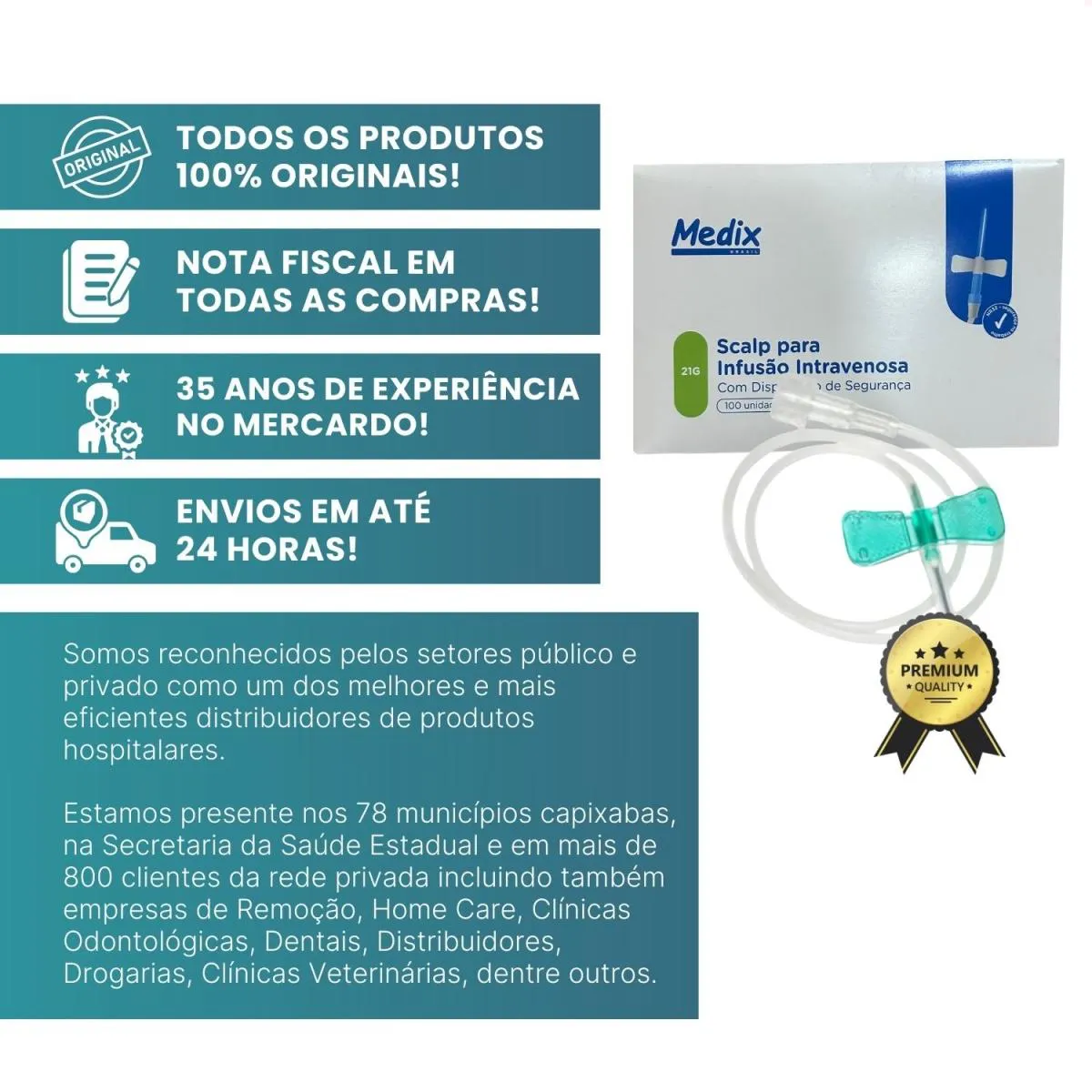 Desde 1990 atuamos com foco em licitações públicas para atendimento a hospitais e clínicas médicas do ES. Somos reconhecidos pelos setores público e privado como um dos melhores e mais eficientes distribuidores de produtos hospitalares, afinal, estamos presentes nos 78 municípios capixabas, na Secretaria da saúde Estadual e em mais de 800 clientes da rede privada, incluindo também empresas de Remoção, Home Care, Clínicas Odontológicas, Dentais, Distribuidores, Drogarias, Clínicas Veterinárias, dentre outros.