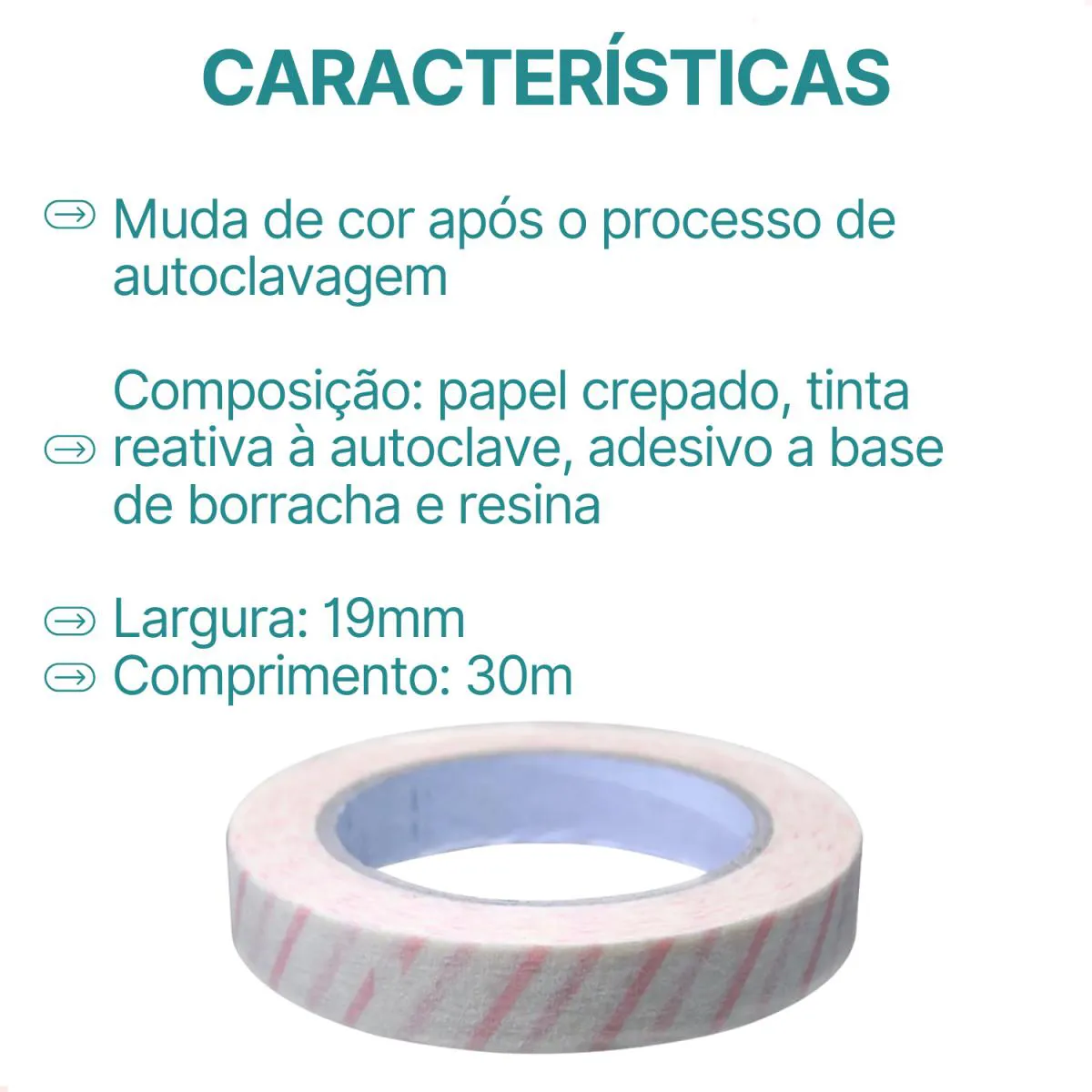 - Composição: papel crepado, tinta reativa à autoclave, adesivo a base de borracha e resina