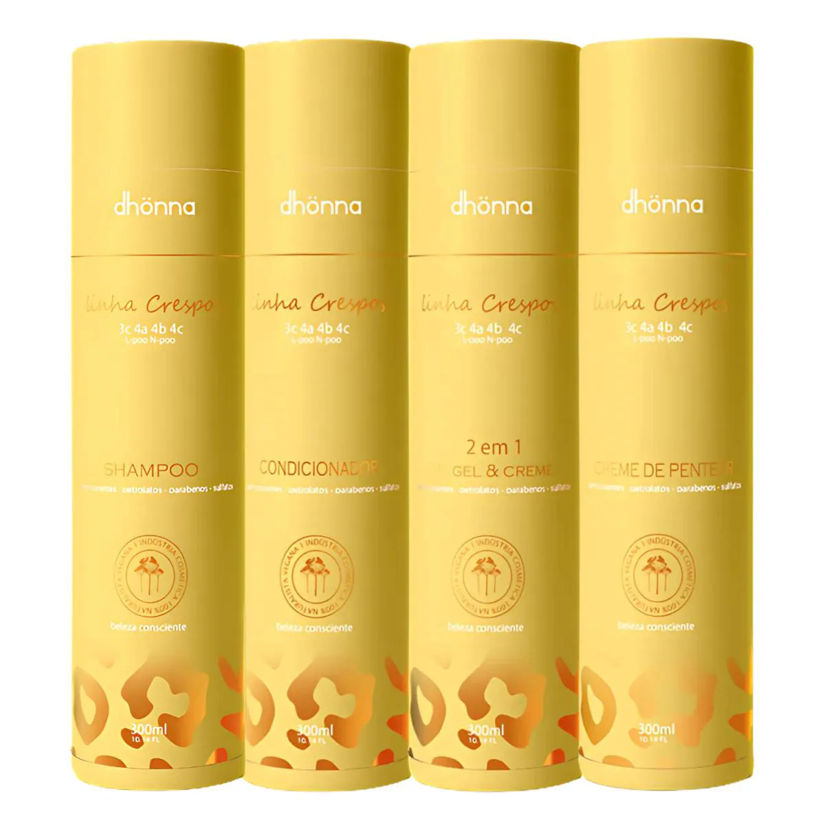 Kit Dhonna Crespos – 4 Produtos de Nutrição e Definição – 300mL Cada O Kit Crespos Dhonna é a escolha ideal para quem deseja cachos saudáveis, nutridos e definidos. Composto por shampoo, condicionador, Creme de Pentear e Gel & Creme, esse kit foi desenvolvido especialmente para cabelos crespos e cacheados (3C, 4A, 4B, 4C), garantindo limpeza suave, hidratação profunda e definição impecável. Nutrição intensa e hidratação duradoura