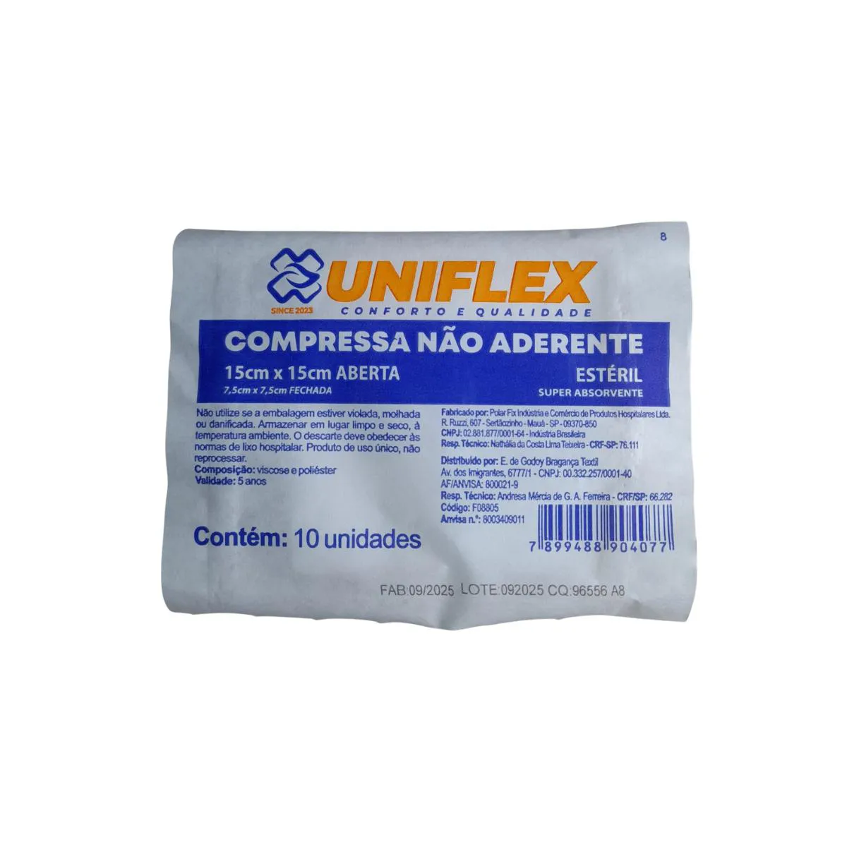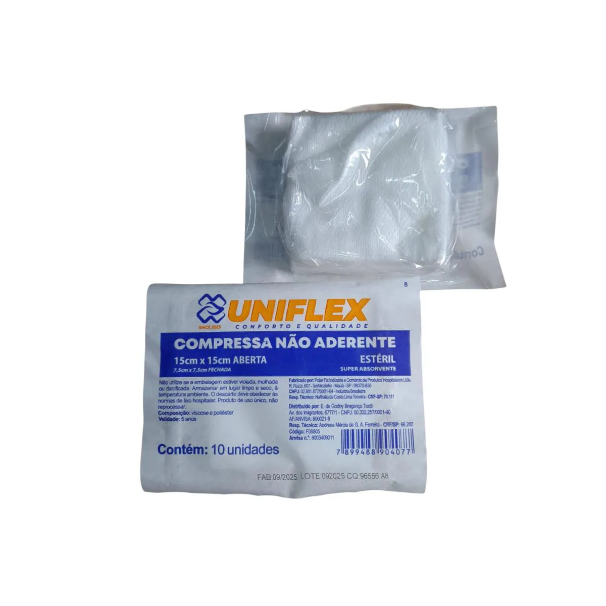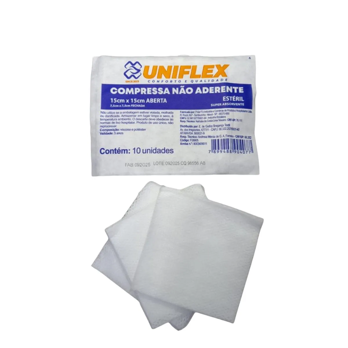 Pacotinhos individuais com 10 unidades cada. A compressa de gaze não aderente da Unicenter, de nome comercial Uniflex, é um curativo projetado para não grudar em feridas, reduzindo a dor e o trauma durante a troca de curativos. Indicada para feridas cirúrgicas, queimaduras e úlceras, ela protege o local enquanto permite a drenagem de fluidos. Principais Características e Benefícios: