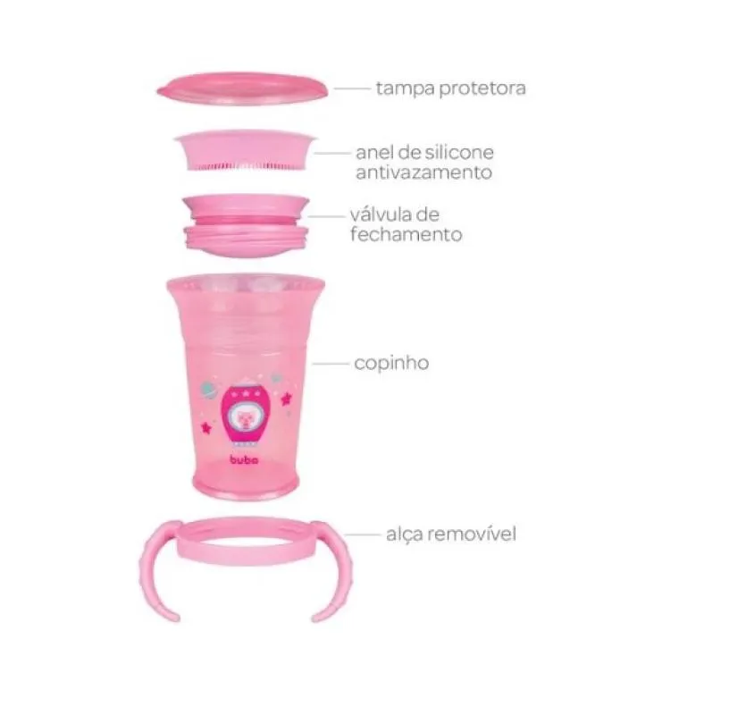 O copo de Treinamento 360° com Alça da Buba foi desenvolvido para facilitar o aprendizado para o uso do copo de adulto. Ele possui alças que permite a criança segurá-lo com firmeza! Sua tampa possui vedação com silicone que serve como válvula evitando vazamentos, assim a criança poderá tomar o suco, água, leite em qualquer posição de forma suave e tranquila. A cada gole digerido, a válvula siliconada sela automaticamente não desperdiçando o conteúdo e principalmente não vaza no rostinho ou roupinha da criança. Você pode girar o copo 360° sem deixar a bebida cair mesmo estando de cabeça para baixo. Ele é um ótimo utensílio para dar segurança à sua criança nesta fase tão importante que é desenvolver e estimular autonomia!