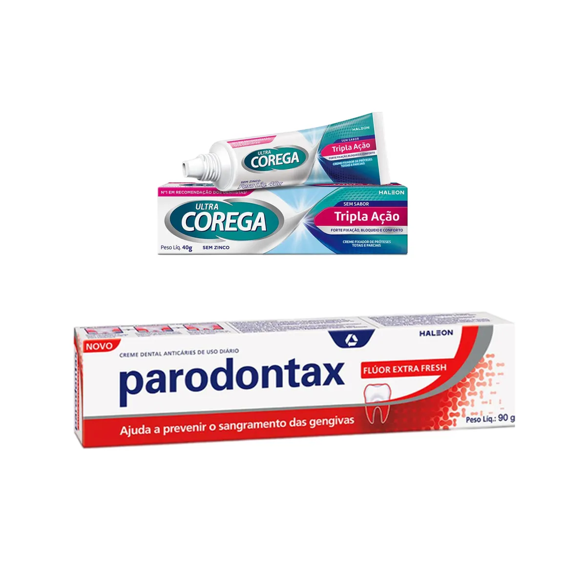 O que é e para que serve o Kit Creme Fixador de Dentadura Ultra Corega Tripla Ação Sem Sabor + creme dental Parodontax Flúor Extra Fresh?