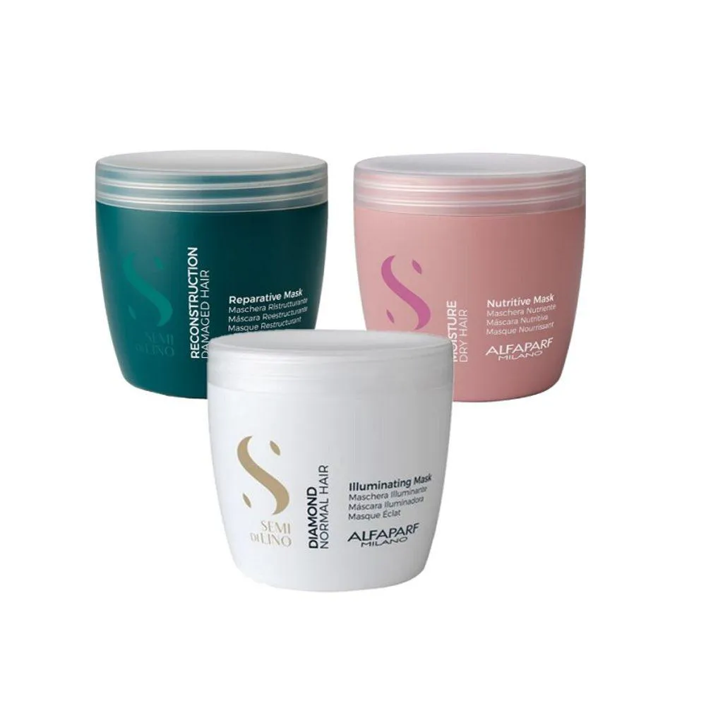 01 Máscara Alfaparf Semi DiLino Reconstruction Reparative 500ml Kit de tratamento indicado para cabelos danificados a secos. - Máscara Alfaparf Semi Di Lino Diamond Illuminating: revitaliza, protege e ilumina! Condiciona e hidrata para um brilho extremo, deixando o cabelo macio, sedoso e leve. - Máscara Alfaparf Semi di Lino Moisture: tratamento intensivo, nutre e hidrata a fibra capilar, deixando os fios mais macios e brilhantes - Máscara Alfaparf Semi DiLino Reconstruction Reparative: fortalece e reestrutura o córtex capilar melhorando sua resistência e sua estrutura. Ingredientes: Urban Defence Pro: ingrediente biotecnológico obtido através de um processo natural de fermentação, protege totalmente os fios contra a poluição. Shine Complex: extrato de linhaça doa um brilho único, extremo e por até 24 horas aos cabelos, da raiz até as pontas. Color Fix Complex: antioxidante, possui filtro UV que protege contra agressões externas para manter o brilho e a cor dos fios por mais tempo. Mesmo depois de 9 lavagens, a reflexão é intensa e brilhante (até 91%). Modo de usar: