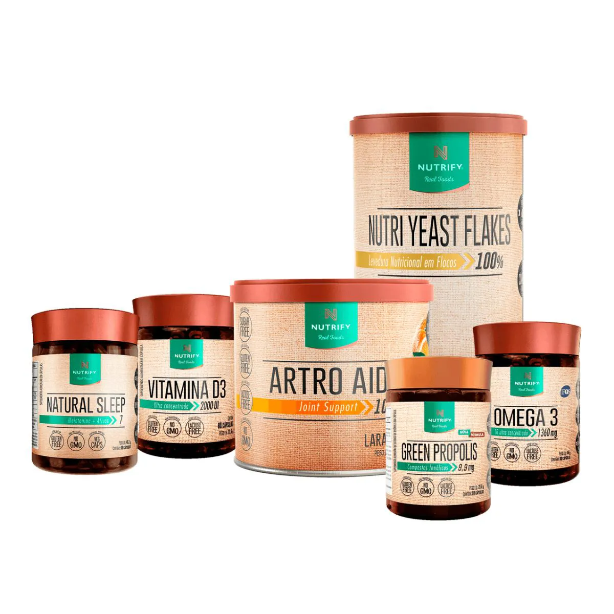 O kit é composto por: - 1 Natural Sleep - 1 Green Propolis - 1 Nutri Yeast Flakes 300 g - 1 Vitamina D3 120 caps - 1 Artro Aid - 1 Omega 3