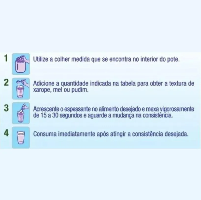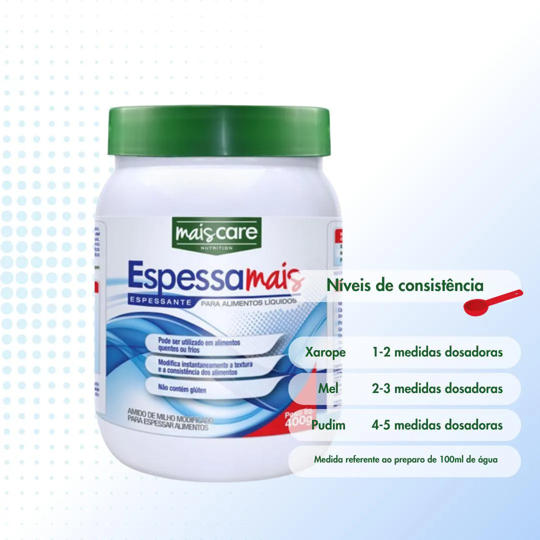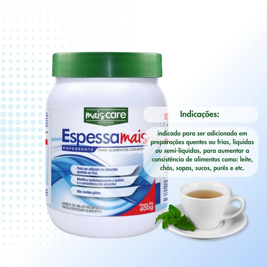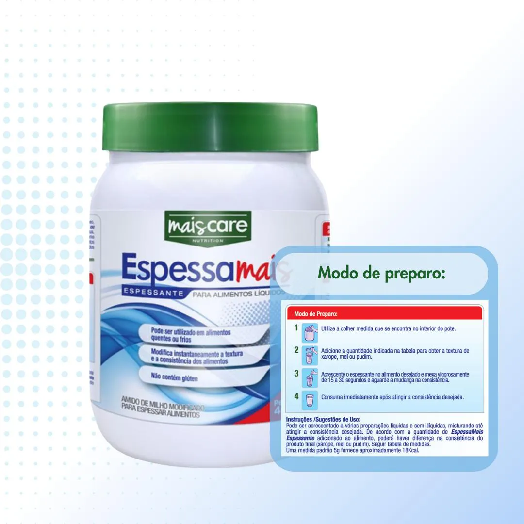 ESPESSAMAIS MAIS CARE NUTRITION: SEGURANÇA E CONFORTO NA alimentação.O EspessaMais Mais Care Nutrition 400g é um espessante alimentar de alta qualidade, desenvolvido para proporcionar mais segurança e conforto na alimentação de pessoas com disfagia (dificuldade para engolir). Formulado com amido modificado, ele confere a consistência desejada a líquidos (como água, sucos, chás) e preparações alimentares (sopas, purês), tornando-as mais seguras para ingestão e reduzindo o risco de engasgos e aspiração. Com sabor neutro, o EspessaMais não altera o paladar dos alimentos, garantindo a aceitação do paciente. Sua solubilidade é excelente, permitindo um preparo rápido e homogêneo, sem formação de grumos, e sua consistência se mantém estável ao longo do tempo. É a solução ideal para adequar a dieta de forma prática e eficaz, contribuindo para uma nutrição adequada e bem-estar. INDICAÇÕES DE USOO EspessaMais Mais Care Nutrition é indicado para:•Pessoas com disfagia (dificuldade de deglutição) de diversas etiologias.•Adaptação da consistência de líquidos e alimentos para facilitar a ingestão.•Pacientes com risco de aspiração pulmonar.•Uso em dietas orais ou enterais, conforme orientação profissional.•Crianças e adultos que necessitem de controle da consistência alimentar. BENEFÍCIOS•Proporciona segurança ao engolir líquidos e alimentos.•Sabor neutro: não altera o paladar das preparações.•Fácil de preparar: dissolve rapidamente e sem grumos.•Mantém a consistência estável por mais tempo.•Permite o controle preciso da espessura (néctar, mel, pudim).•Fonte de carboidratos.•Livre de glúten e lactose.•Embalagem econômica de 400g. COMO USARA quantidade de EspessaMais Mais Care Nutrition a ser utilizada varia de acordo com a consistência desejada e a orientação de um profissional de saúde (nutricionista, fonoaudiólogo). Adicione a colher-medida de EspessaMais ao líquido ou alimento e misture bem até dissolver completamente e atingir a consistência desejada.•Consistência xarope/néctar: 1 colher medida (aprox. 5g) para 100ml de líquido.•Consistência mel: 2 colheres medida (aprox. 10g) para 100ml de líquido.•Consistência pudim: 3 colheres medida (aprox. 15g) para 100ml de líquido.•Misturar imediatamente após adicionar o pó. Aguardar alguns minutos para atingir a consistência ideal.CUIDADOS E CONSERVAÇÃOMantenha a embalagem de EspessaMais Mais Care Nutrition sempre bem fechada, em local fresco e seco, ao abrigo da luz solar direta e da umidade. Consumir o produto dentro do prazo de validade indicado na embalagem. Após aberto, consumir em até 30 dias. Manter fora do alcance de crianças. INFORMAÇÕES IMPORTANTES•O EspessaMais Mais Care Nutrition é apresentado em lata de 400g.•Ingredientes: Maltodextrina, amido de milho modificado.•Não contém glúten. Não contém lactose.•Este produto não é um medicamento.•Utilizar somente sob orientação de médico ou nutricionista.•Gestantes, lactantes e crianças devem consultar um •profissional de saúde antes do consumo.•O uso inadequado pode acarretar riscos. Não exceder a recomendação diária de consumo.