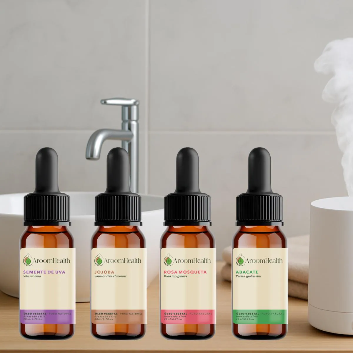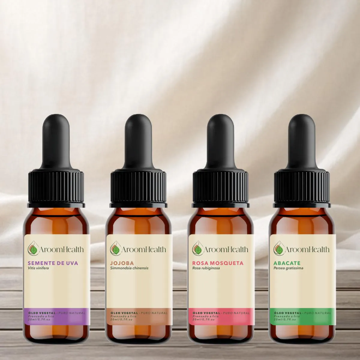 Kit de Óleos Vegetais Puro Natural – Abacate, Rosa Mosqueta Rubiginosa, Semente de Uva e Jojoba – 20 ml cada | AroomHealth Eleve seu cuidado de pele e cabelo com o Kit de Óleos Vegetais AroomHealth, formulado com óleos 100% puros, naturais e prensados a frio de Abacate, Rosa Mosqueta Rubiginosa, Semente de Uva e Jojoba.