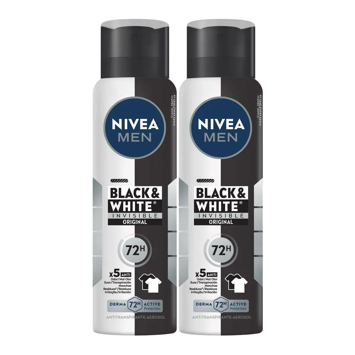 Nivea Men Black&White é um desodorante em aerossol que, além de oferecer proteção antitranspirante por até 72 horas, possui uma fórmula poderosa antibacteriana - eliminando 99,99% das bactérias causadoras do mau odor - e uma tecnologia inovadora que protege as fibras dos tecidos. Ele evita manchas brancas nas roupas e o surgimento de manchas amarelas.