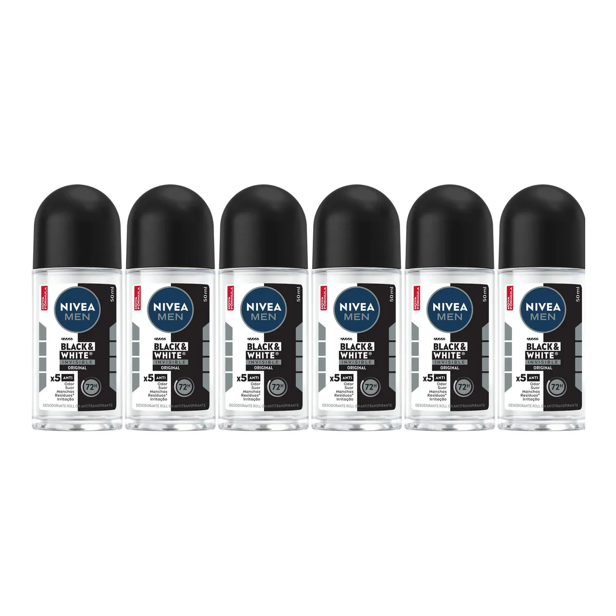 Kit Desodorante Antitranspirante Roll-On Nivea Men Black & White Invisible 72h 50ml 6 unidades