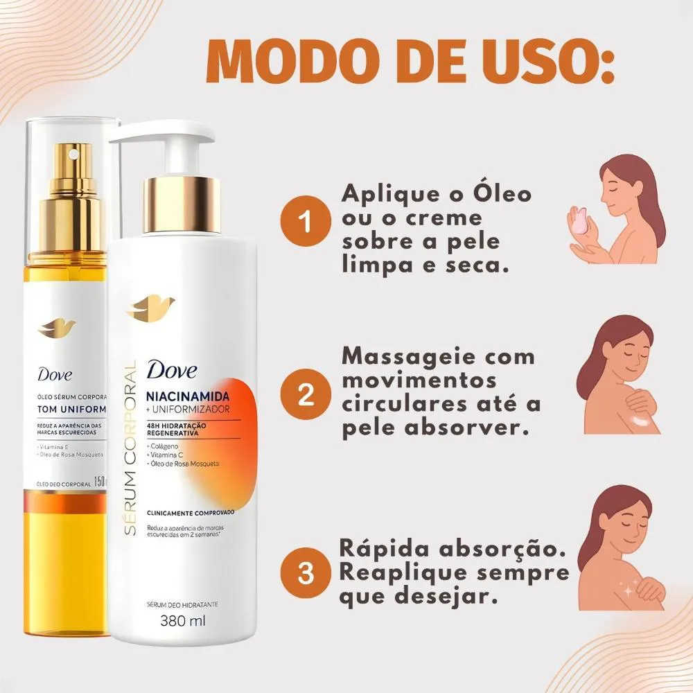 Para melhores resultados, aplique o Óleo Deo Corporal Dove sobre a pele limpa e seca, massageando suavemente até completa absorção. Em seguida, utilize o Sérum Deo Hidratante Dove, espalhando uniformemente por todo o corpo para selar a hidratação. Use diariamente para uma pele visivelmente mais uniforme e hidratada.