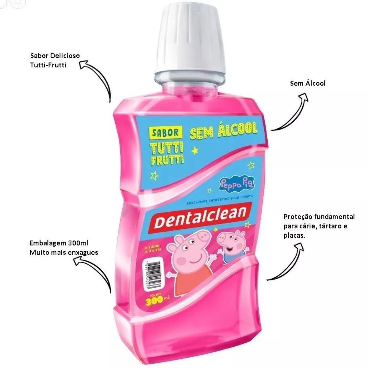 É um kit premium infantil de higiene bucal da marca Dentalclean com tema da Peppa Pig, desenvolvido especialmente para incentivar a escovação diária das crianças.
