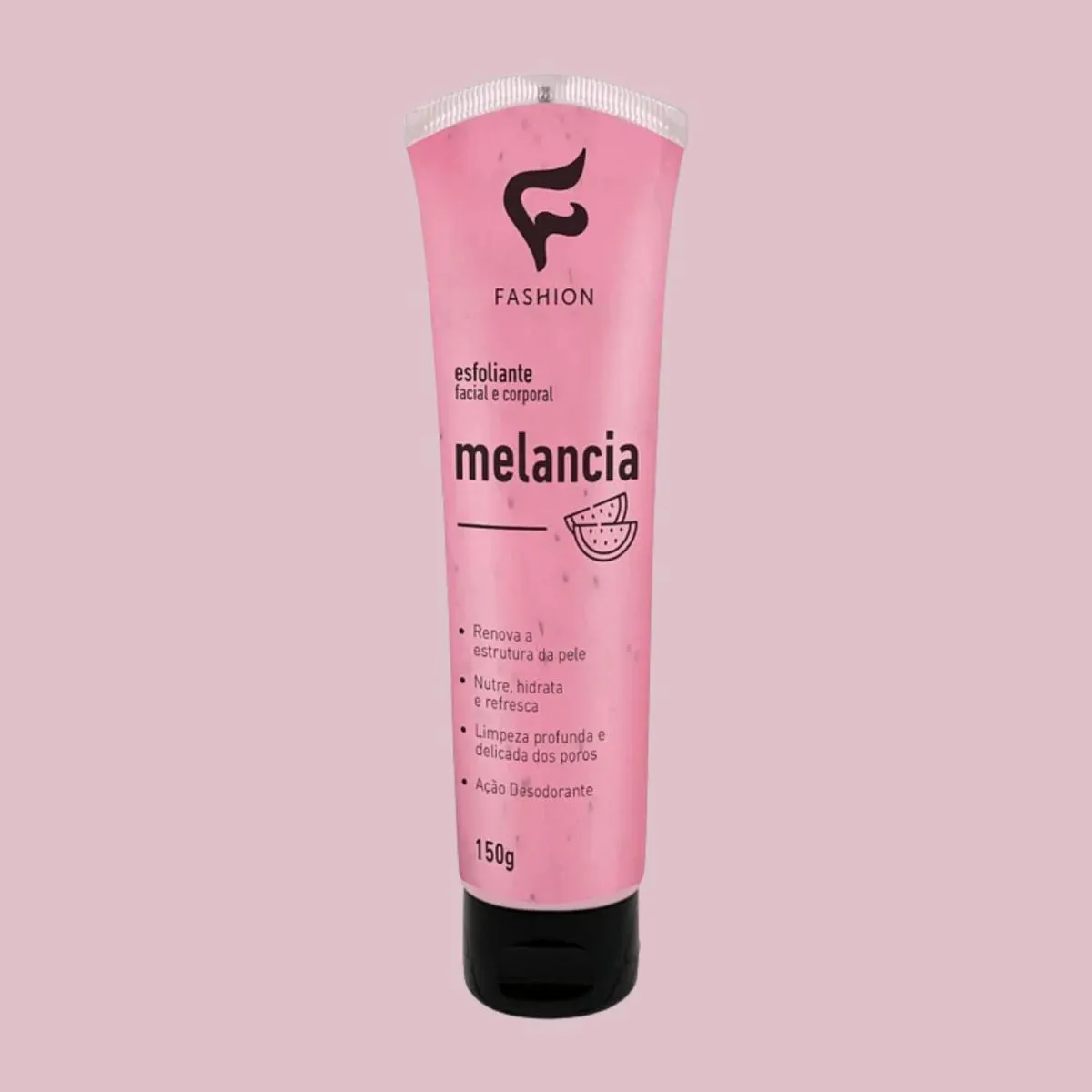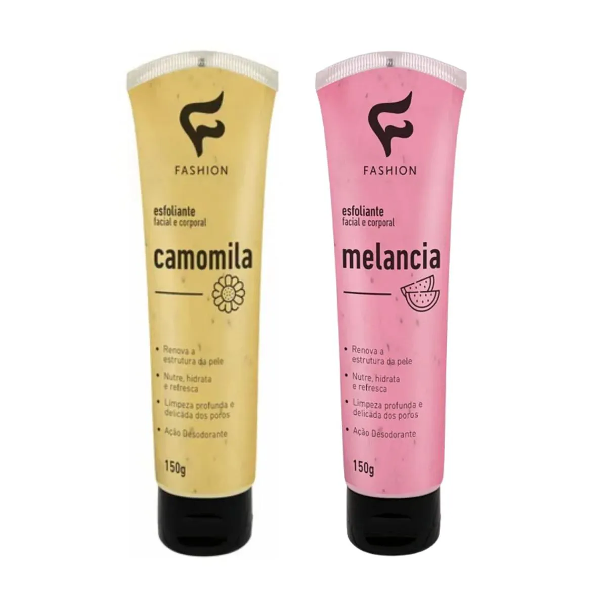 Kit esfoliante Corporal 150G Melancia e Camomila - FashionNeste produto está sendo enviado 1(uma) unidade do Esfoliante Corporal de Melancia com 150g e 1(uma) unidade do Esfoliante de Camomila com 150gEsfoliante Corporal e Facial 150g Melancia - FashionEsfoliante Facial e Corporal Fashion 150g Melancia oferece uma esfoliação suave e refrescante, removendo impurezas e células mortas para uma pele mais macia e revitalizada. Formulado com extrato de melancia, rico em vitaminas e antioxidantes, ajuda a hidratar e proteger a pele, deixando uma sensação de frescor e toque sedoso. Ideal para uso no rosto e no corpo.