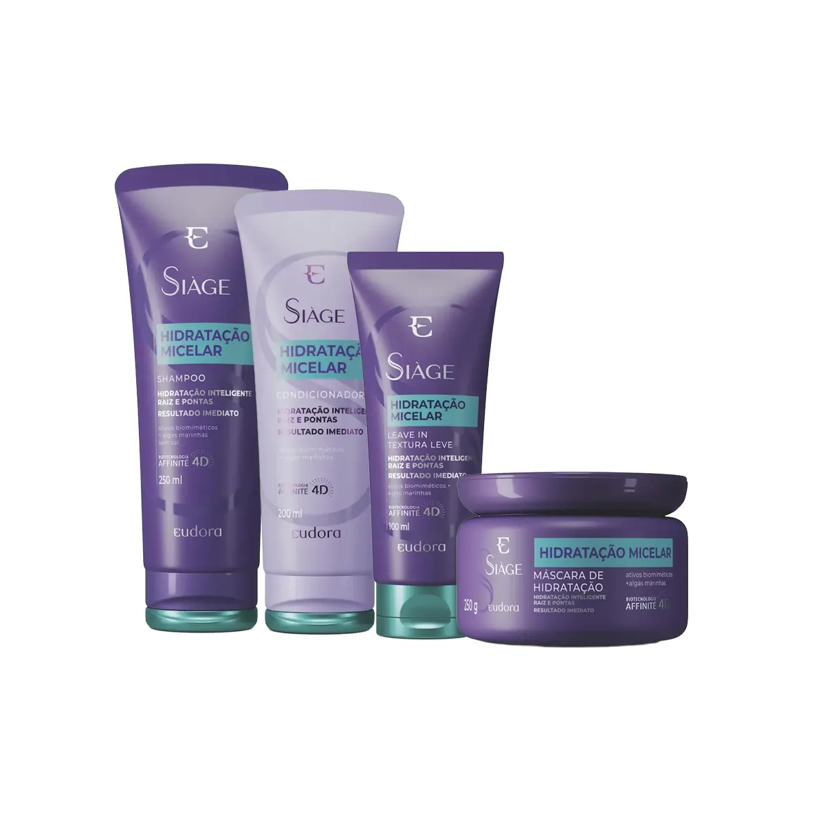 O Kit Eudora Siàge Hidratação Micelar Shampoo + Condicionador + Máscara + Leave-In é uma linha completa de tratamento capilar vegano e cruelty free, desenvolvida para todos os tipos de cabelo. Sua fórmula é enriquecida com Ativos Biomiméticos e Algas Marinhas, que recuperam a aparência saudável dos fios e protegem contra agressões externas como sol, vento e chuva. O sistema Micelar inteligente identifica o ressecamento da raiz às pontas, reequilibra a carga de ativos, devolve maciez e brilho, e previne danos sem sobrecarregar os fios. O shampoo limpa suavemente, o condicionador desembaraça e retém a hidratação, a máscara oferece hidratação profunda por 48 horas e o leave-in protege termicamente até 230°, permitindo o uso de ferramentas térmicas sem danificar os cabelos.