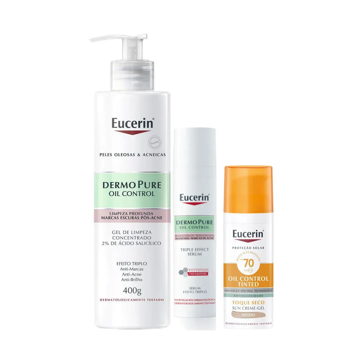 Kit Facial Eucerin Gel de Limpeza Dermo Pure Concentrado 400g + Sérum DermoPure Oil Control Efeito Triplo 40ml + Protetor Solar Sun Oil Control Tinted FPS 70 Médio 50ml