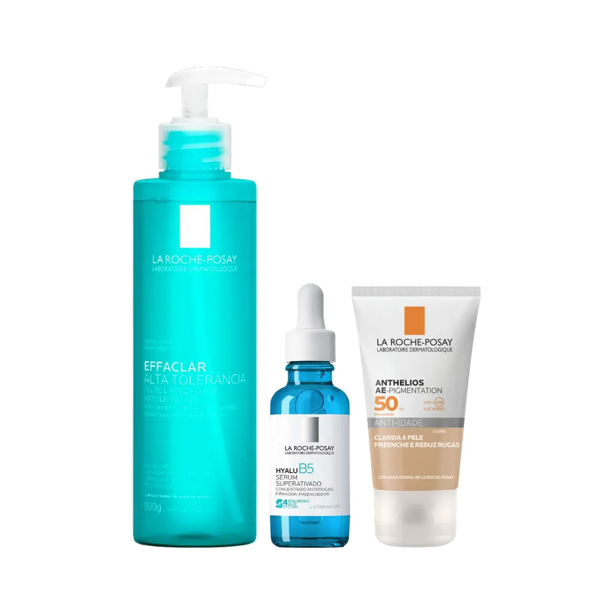 O que é e para que serve o Kit Facial La Roche-Posay Gel de Limpeza Effaclar Alta Tolerância + Sérum antirrugas Hyalu B5 Super Ativado + Protetor Solar Anthelios AE-Pigmentation FPS 50 Anti-Idade Pele Clara?