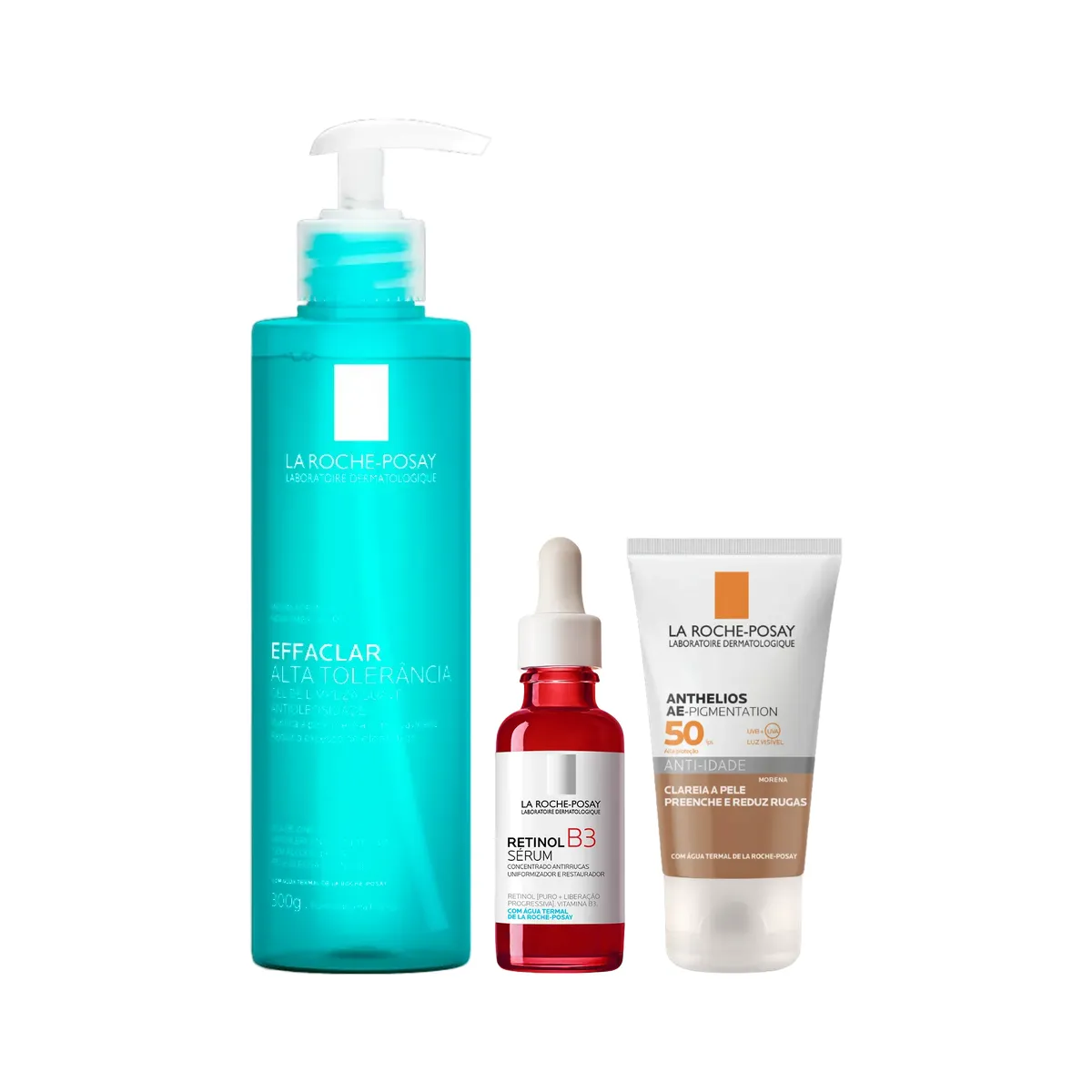 Kit Facial La Roche-Posay Gel de Limpeza Effaclar Alta Tolerância 300g + Sérum Concentrado Anti-Idade Retinol B3 30ml + Protetor Solar Anthelios AE-Pigmentation FPS 50 Anti-Idade Pele Morena 40g