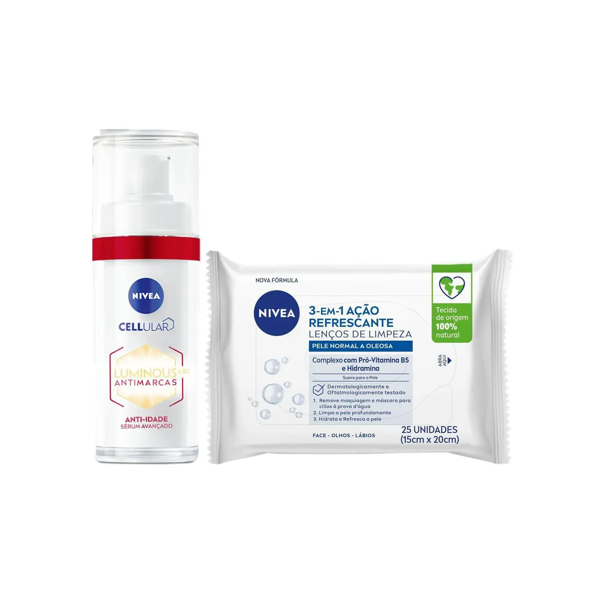Kit Facial Nivea Sérum Cellular Luminous 630® Antimarcas Anti-idade 30ml + Lenço Demaquilante 3 em 1 Ação Refrescante 25 unidades