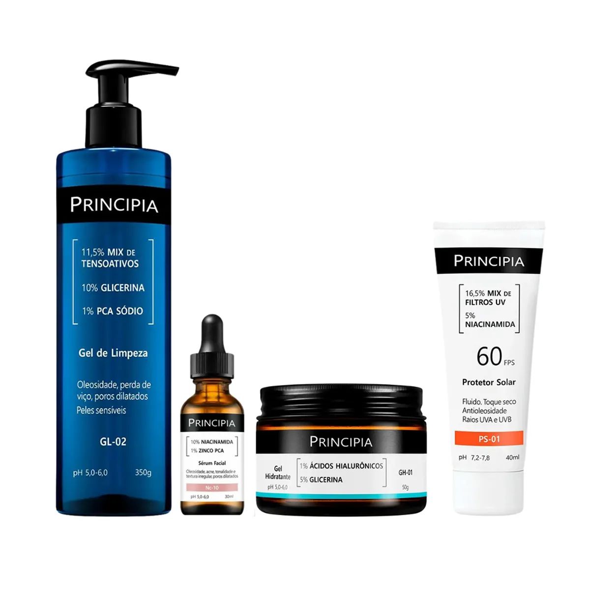 O Kit Facial Principia Skincare Protetor Solar PS-01 FPS 60 + Gel de Limpeza Suave GL-02 + Sérum Anti-Idade NC-10 + Gel Hidratante GH-01 é um conjunto de produtos desenvolvidos para proteger, limpar, tratar e hidratar a pele de forma eficaz. O protetor solar Principia Skincare PS-01 FPS 60 contém 16,5% de mix de filtros UV e 5% de Niacinamida, protegendo contra raios UVA, UVB, luz visível e azul. O gel de limpeza suave Principia Skincare GL-02 remove impurezas e promove hidratação, com 11,5% de tensoativos, 10% de glicerina e 1% de PCA Sódio. O sérum facial anti-idade Principia Skincare NC-10 possui 10% de Niacinamida e 1% de Zinco PCA, uniformizando a pigmentação, clareando manchas e controlando a oleosidade. Por fim, o gel hidratante Principia GH-01 contém 1% de ácidos hialurônicos e 5% de glicerina, proporcionando hidratação intensa e prolongada.