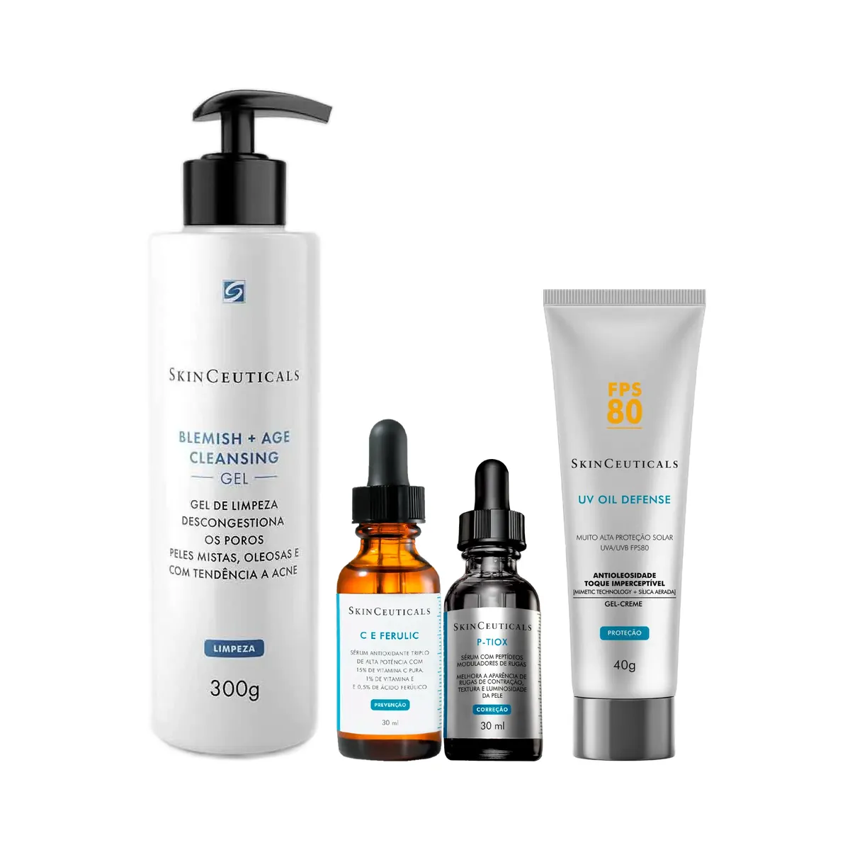 Kit Facial SkinCeuticals Gel de Limpeza Blemish + Age Cleansing 300g + Sérum Anti-Idade C E Ferulic 30ml + Sérum Anti-Idade P-Tiox 30ml + Protetor Solar Oil Defense FPS 80 40g