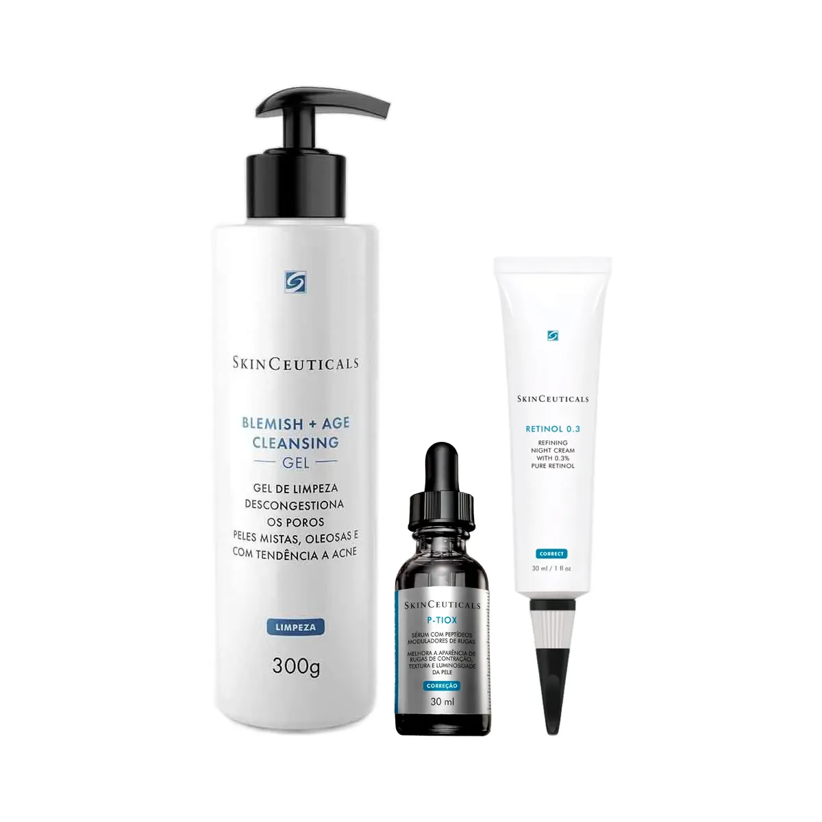 O que é e para que serve o Kit Facial SkinCeuticals Gel de Limpeza Blemish + Age Cleansing + Sérum Anti-Idade Skinceuticals P-Tiox + Creme Anti-Idade SkinCeuticals Noturno Retinol 0,3?