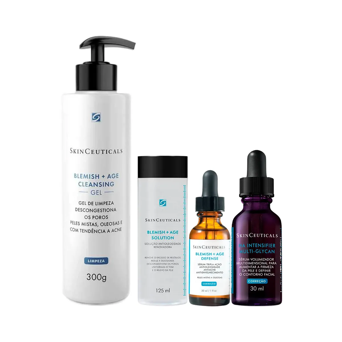 Kit Facial SkinCeuticals Gel de Limpeza Blemish + Age Cleansing 300g + Tônico Blemish + Age Solution 125ml + Sérum Antioleosidade e Antiacne Blemish + Age Defense 30ml + Sérum Anti-idade H.A. Intensifier Multi-Glycan 30ml