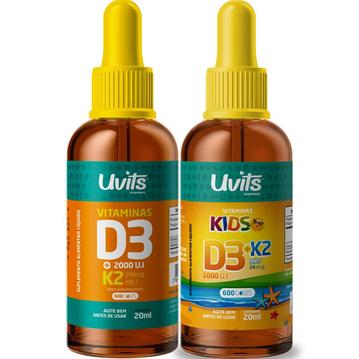 1 Vitamina D3 2000ui + K2 24mcg 20ml 600 Doses Uvits e 1 Vitamina D3 1000ui + K2 24mcg Kids 20ml 600 Doses Uvits