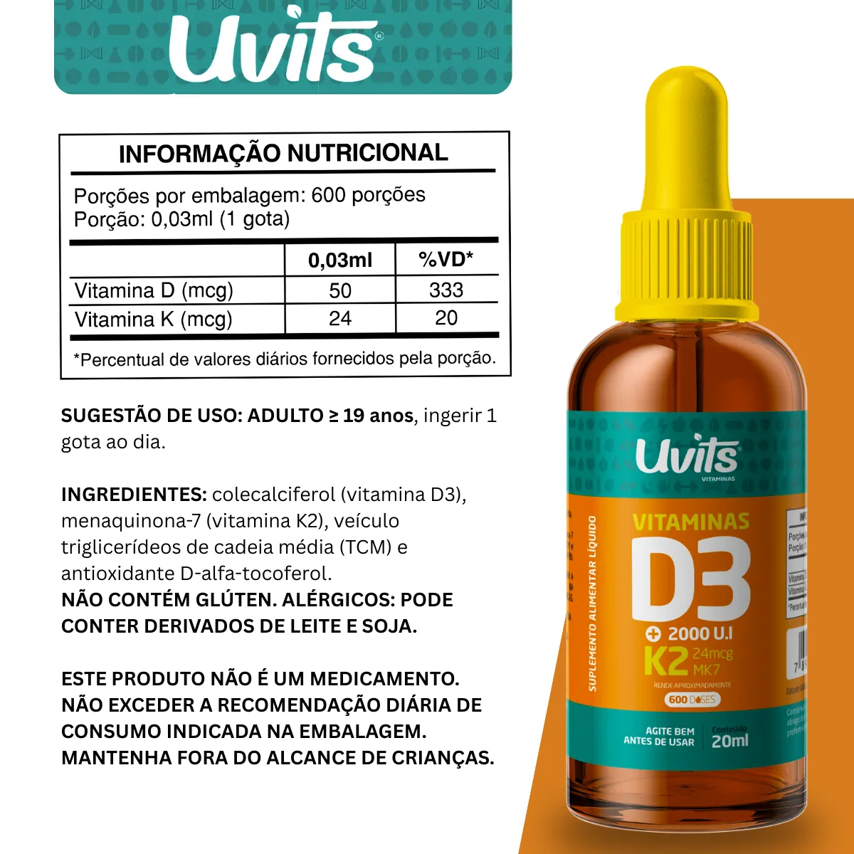 Composição: Colecalciferol (vitamina D3), menaquinoa-7 (vitamina K2), veículo triglicerídeos de cadeia média (TCM) e antioxidante D-alfa-tocoferol (vitamina e). Cada gota (vegana) fornece: 2000 UI de Vitamina D3 e 24 mcg de Vitamina K2. NÃO CONTÉM GLÚTEN. Alérgicos: PODE CONTER LÁTEX NATURAL E DERIVADOS DE LEITE.