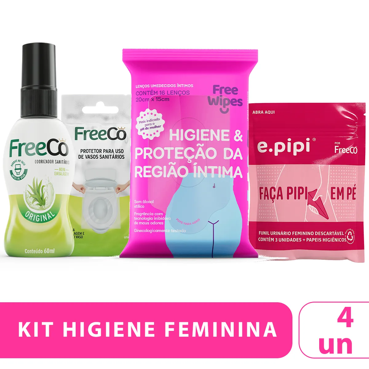Kit FreeCô Bloqueador de Odores Original 60ml + Protetor de Assento Sanitário 3un + Lenço Umedecido Íntimo 16un + Funil Urinário Descartável Epipi 3un+ Papel Higiênico
