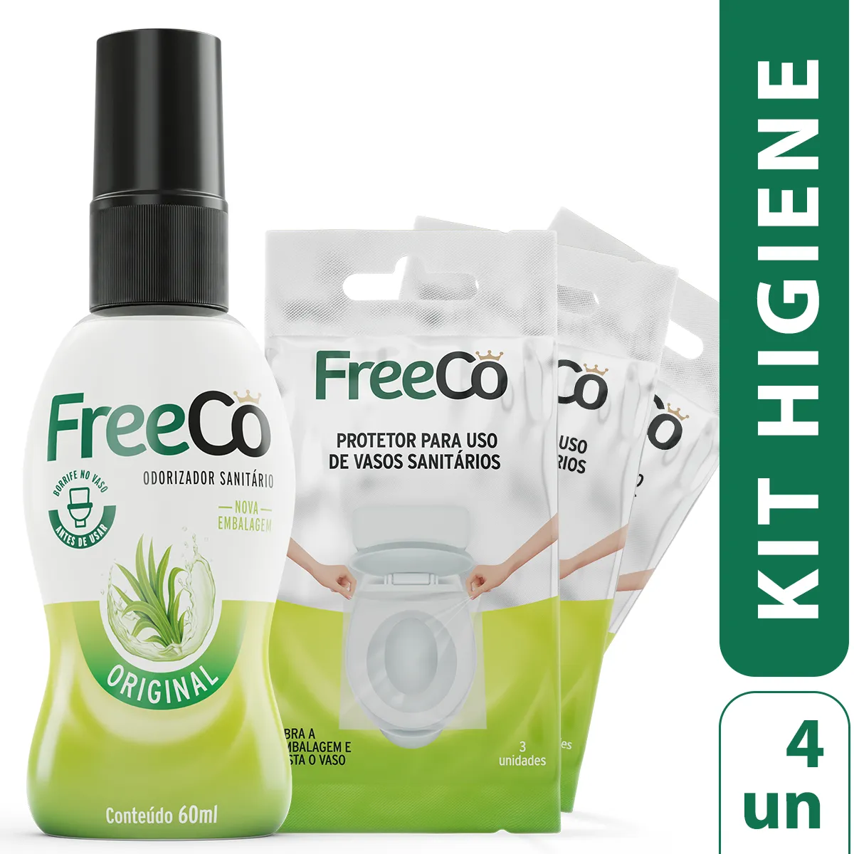 Kit FreeCô Protetor de Assento Sanitário 3 unidades 3 pacotes + Bloqueador de Odores Sanitários Original 60ml