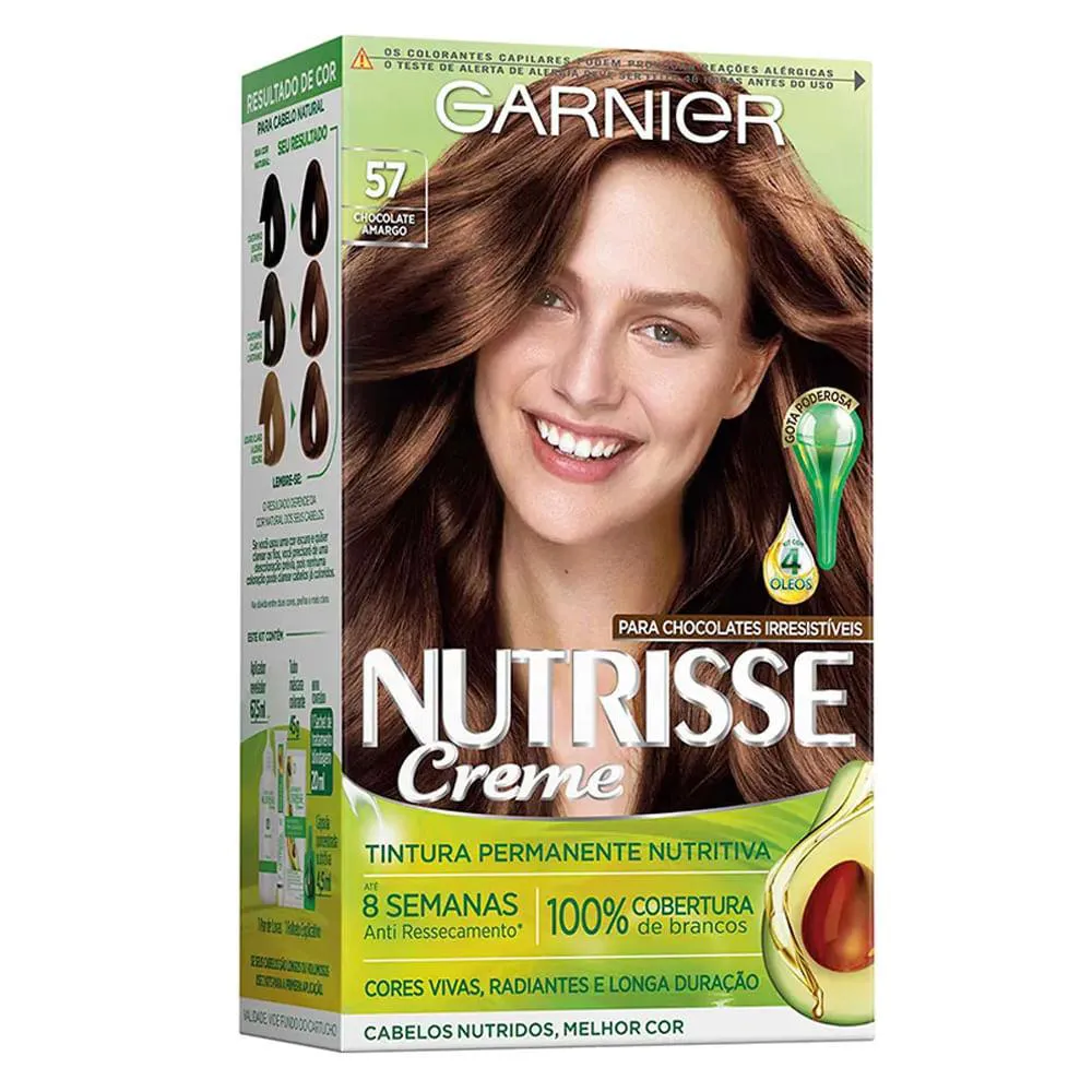Nutrisse Creme tem textura cremosa e aveludada que cobre perfeitamente cada fio, sem escorrer. Sua poderosa gota de óleo de frutas faz com que ele nutra enquanto colore! Além disso, a fórmula do novo tratamento pós-coloração de Nutrisse Creme é composta por 3 ricos óleos: abacate, cassis e oliva, proporcionando uma blindagem nutritiva que envolve seus cabelos, reparando intensamente e selando os fios. O Novo Nutrisse Creme garante 100% de cobertura até nos fios brancos mais difíceis. Cabelos incrivelmente macios e com brilho espelhado. Em cabelos nutridos a cor se revela muito mais rica e brilhante.