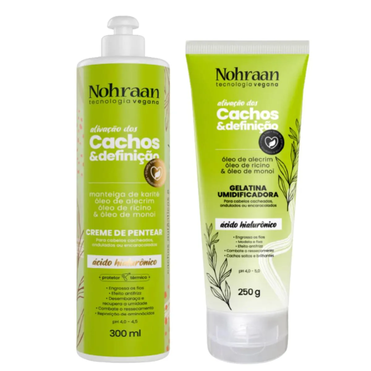 Kit Gelatina e Creme de pentear Cachos Alecrim & Rícino 250g Nohraan Neste produto está sendo enviado 1(uma) unidade da Gelatina Umidificadora Cachos Alecrim & Rícino 250g e 1(uma) unidade do Creme de Pentear Cachos Alecrim & Rícino 300ml Nohraan Gelatina Umidificadora Cachos Alecrim & Rícino 250g A Gelatina Umidificadora Nohraan foi desenvolvida para definir, modelar e manter os cachos no lugar por muito mais tempo. Enriquecida com Alecrim e Óleo de Rícino, fortalece os fios, reduz o frizz e proporciona brilho sem pesar, deixando o cabelo com acabamento natural e hidratado. Diferenciais