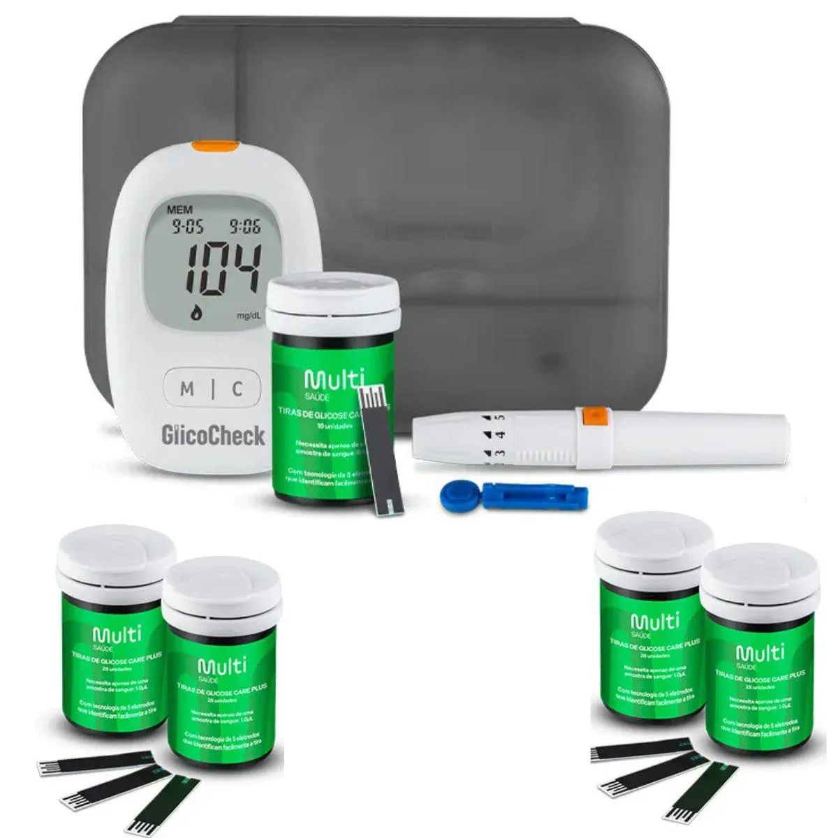 O Kit Glicocheck Care Plus é um conjunto de equipamentos e acessórios para monitoramento de glicemia, composto por um monitor de glicemia, tiras reagentes, lancetador, lancetas, bateria e case para transporte. É uma solução desenvolvida pela Multilaser Saúde para auxiliar pessoas no controle e acompanhamento dos níveis de glicose.
