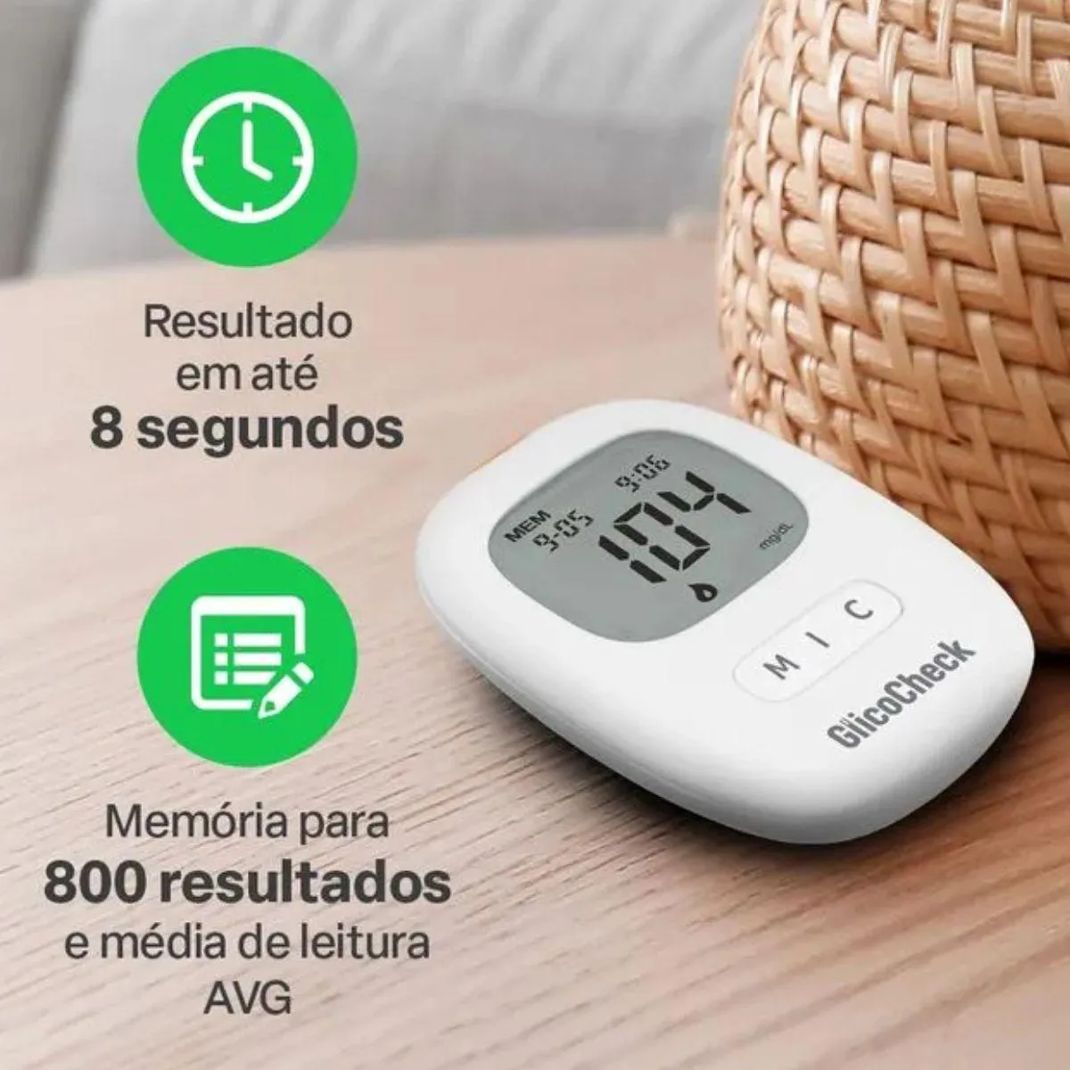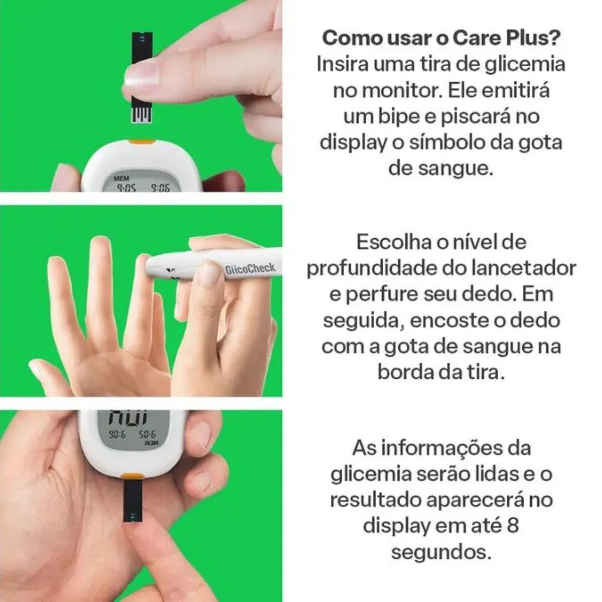 Compatibilidade exclusiva: funciona somente com as tiras de glicemia Glicocheck Care Plus (HC489), garantindo a precisão dos resultados;