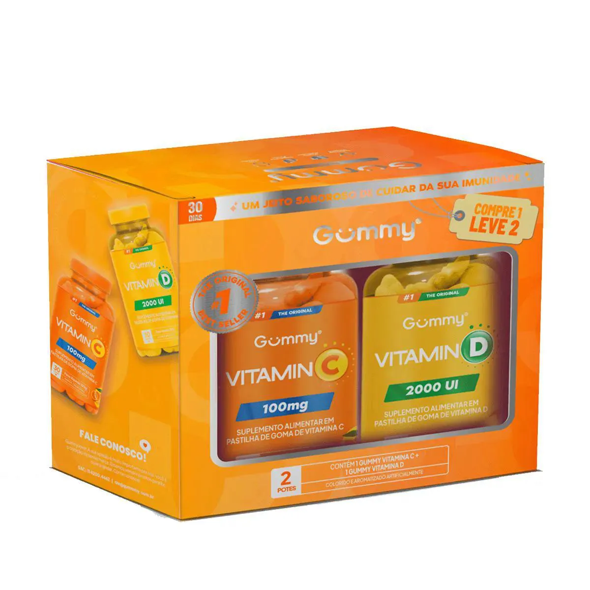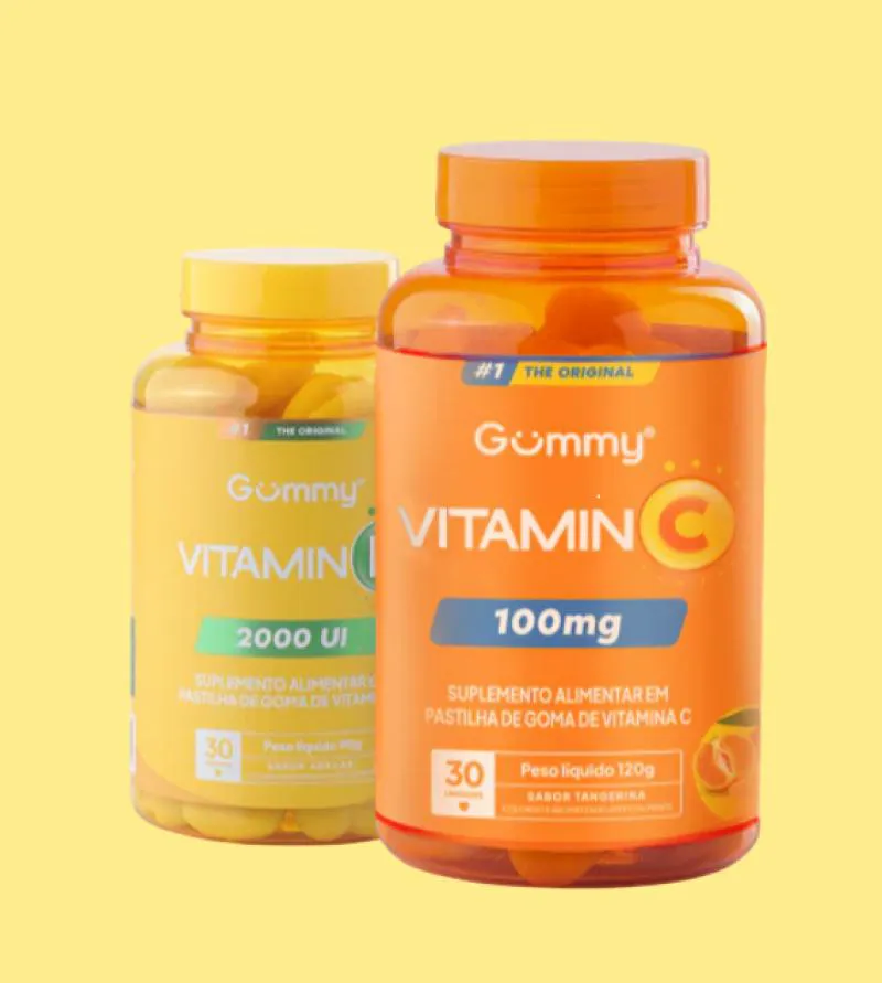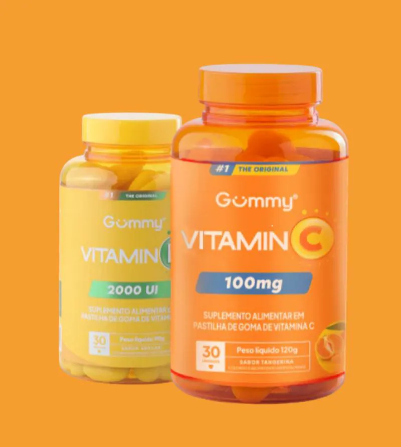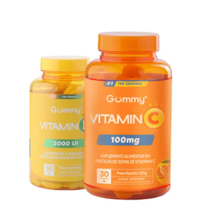 Kit Gummy vitamina c Tangerina 100mg Com 30 + vitamina d Abacaxi 2000UI Com 30 – Gummy Uma nutrição equilibrada tem um papel muito importante na qualidade de vida. Com o ritmo acelerado de muitas pessoas, às vezes, é muito difícil prestar atenção a todos os requisitos que o corpo precisa para estar saudável e forte. Neste sentido, os suplementos cumprem a função de complementar a alimentação e ajudam a obter as vitaminas, minerais, proteínas e outros componentes indispensáveis para o correto funcionamento do organismo. Composição Gummy Vitamina C – Sabor Tangerina: Açúcar, xarope de glicose, ácido ascórbico (Vitamina C), agente de brilho (óleo vegetal e glaceante cera de carnaúba), gelificante pectina, acidulante ácido cítrico, regulador de acidez citrato de sódio, aromatizante, corantes dióxido de titânio e amarelo crepúsculo FCF. Composição Gummy Vitamina C – Sabor Tangerina: Açúcar, xarope de glicose, agente de brilho (óleo vegetal e glaceante cera de carnaúba), vitamina D2 (Ergocalciferol), estabilizantes pectina e maltitol, acidulante ácido cítrico, regulador de acidez citrato de sódio, aromatizante, corantes artificiais dióxido de titânio e tartrazina. NÃO CONTÉM GLÚTEN. ALÉRGICOS: PODE CONTER LEITE, soja, PEIXES. Recomendação: Consumir 1 unidade de goma de cada ao dia. Recomendado para maiores de 9 anos. MANTENHA FORA DO ALCANCE DE CRIANÇAS. Imagens Meramente Ilustrativas. Todas as Informações Divulgadas são de Responsabilidade Exclusiva do Fabricante/fornecedor.