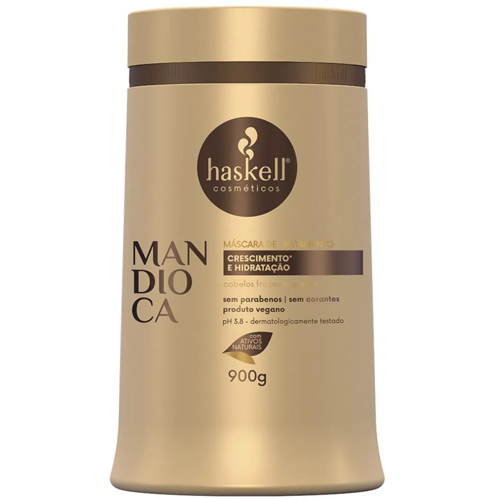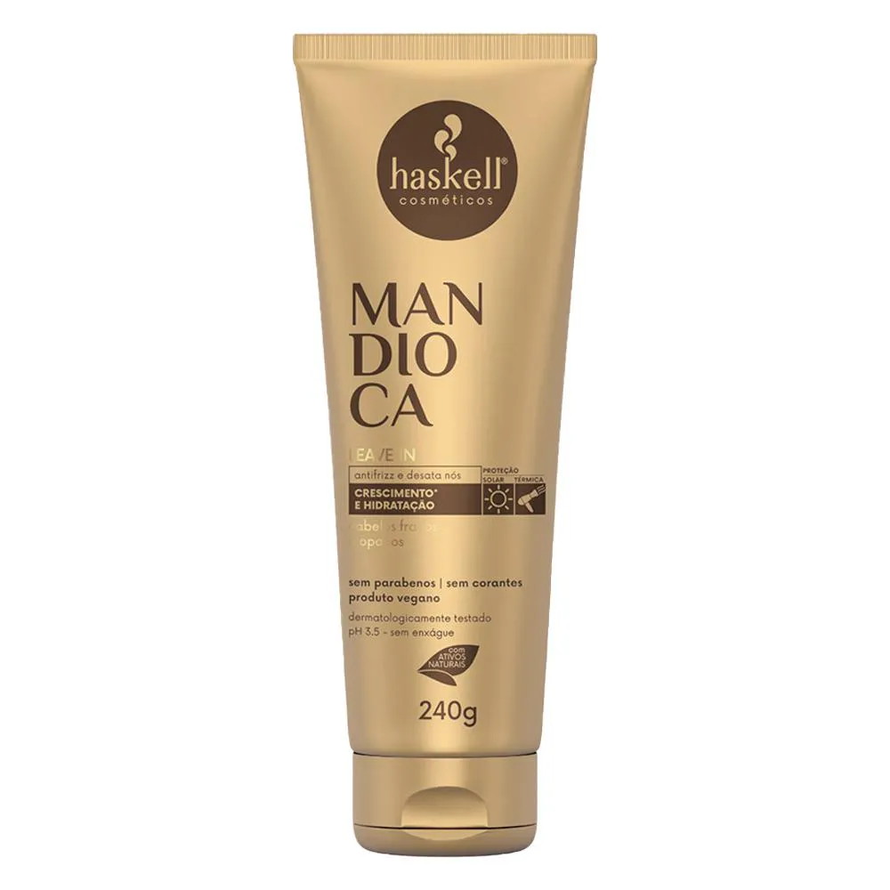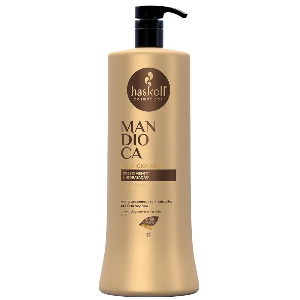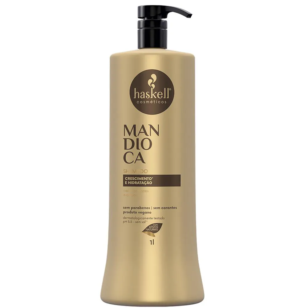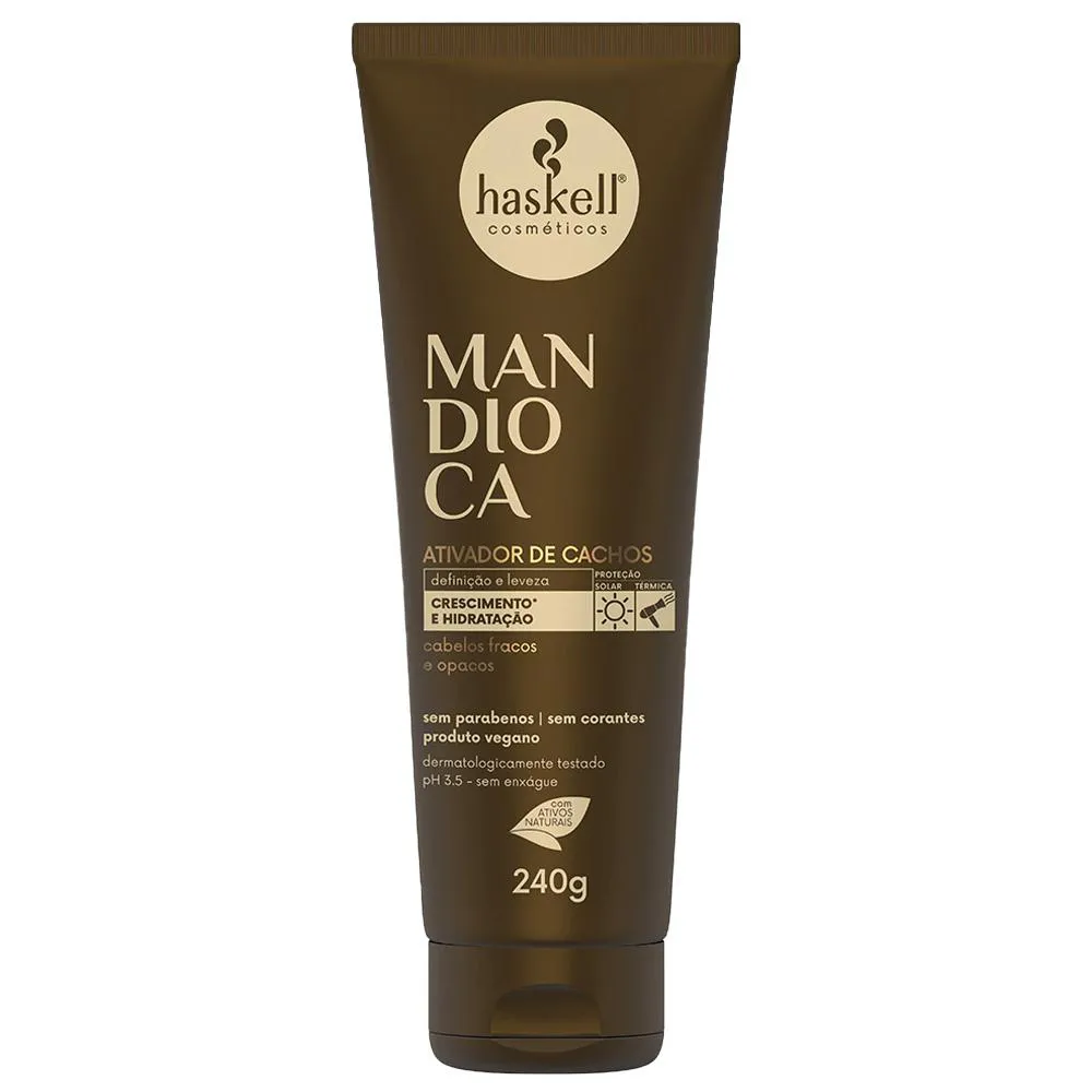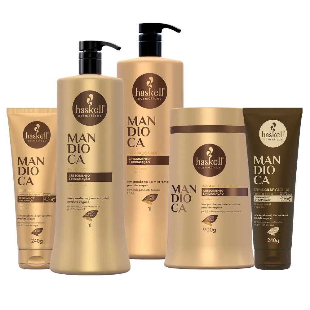 Linha Haskell Mandioca Principal Função: Hidratação e Força Indicação: Para cabelos opacos e ressecados Desenvolvida com a mais alta tecnologia aliada a ativos exclusivos como a mandioca, a linha é rica em vitaminas e nutrientes essenciais ao crescimento dos fios. Rica em vitaminas e nutrientes essenciais ao crescimento dos fios Promove hidratação profunda e fortalecimento dos fios Age no alinhamento das cutículas promovendo brilho intenso aos cabelos opacos Ativos: Extrato da folha de mandioca: • Atua na nutrição da fibra capilar • Rico em vitaminas, proteínas e minerais. • Fortalece os fios, a raiz e as pontas • Auxilia no crescimento do cabelo Óleo de Mamona (Rícino): • Fortalece os fios e tem alto poder hidratante • Combate o envelhecimento dos fios. • Rico em ácidos graxos e antioxidantes • Promove brilho, maciez e intensa hidratação. Este kit contém: - 01 shampoo Haskell Mandioca 1L; - 01 condicionador Haskell Mandioca 1L; - 01 Máscara de Hidratação Haskell Mandioca 900g; - 01 Leave-In Haskell Mandioca 240g; - 01 Ativador de Cachos 240g. Agradecemos a preferência!
