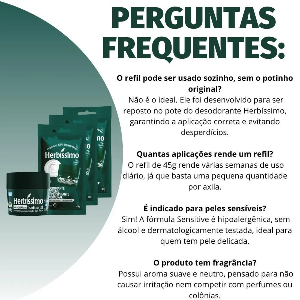 Produto da renomada marca HERBISSIMO, sinônimo de tradição e qualidade no mercado de desodorantes. Formato de refil, permitindo a reutilização da embalagem original e a redução de resíduos, alinhado com práticas sustentáveis. Fórmula tradicional que garante a eficácia esperada pelos consumidores, com a confiança de anos de experiência. Embalagem prática e fácil de usar, ideal para o dia a dia. Dermatologicamente testado, garantindo a segurança e o cuidado com a sua pele.Ocasiões de Uso/Cenários Ideais