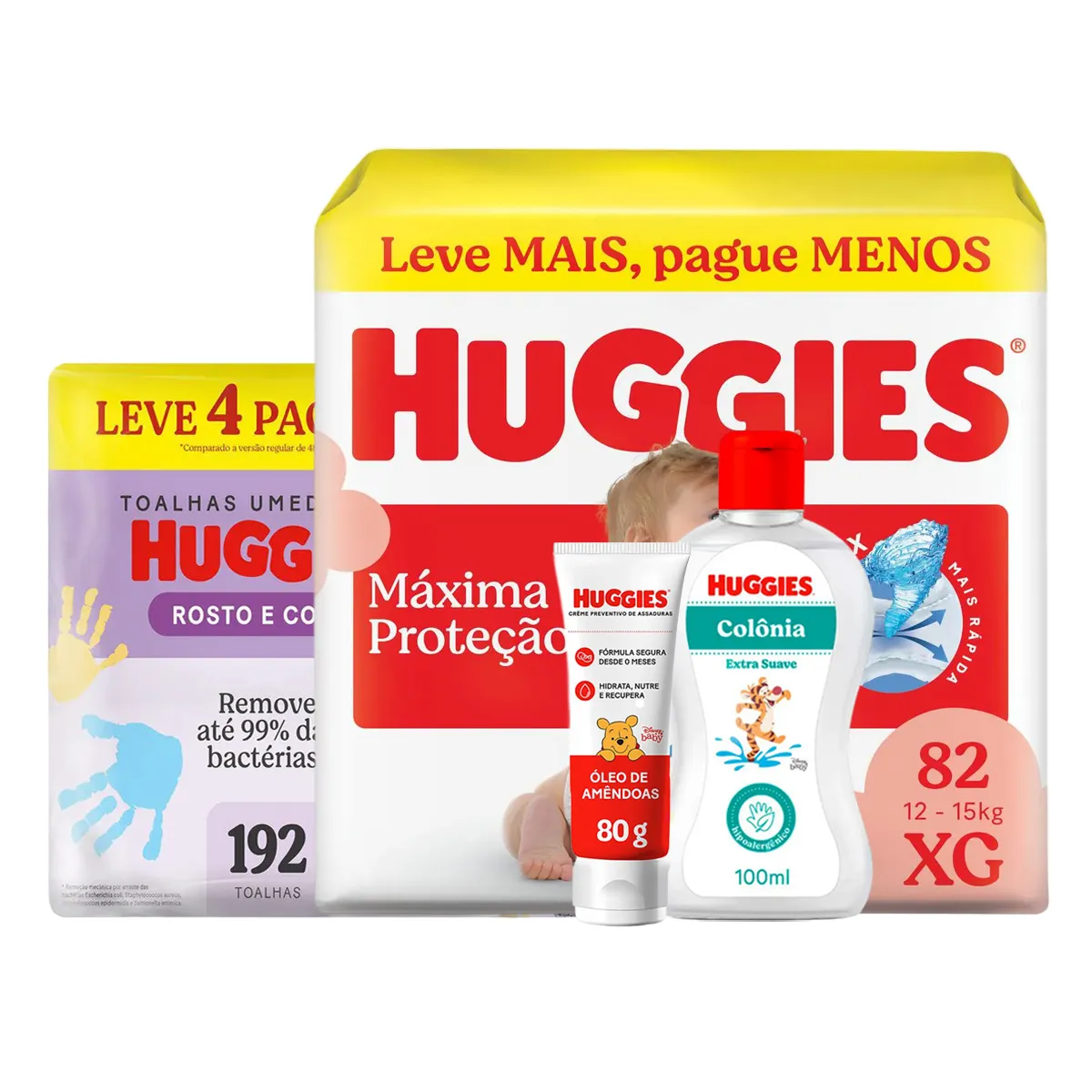 Kit Huggies Fralda Máxima Proteção XG 82 unidades + Lenço Umedecido 192 unidades + Creme Preventivo de Assaduras 80g + Colônia Extra Suave 100ml