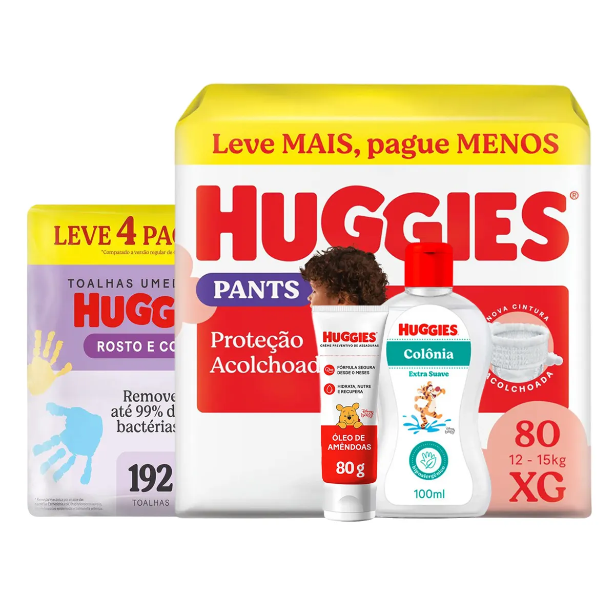 Kit Huggies Fralda Calça XG 80 unidades + Lenço Umedecido 48 unidades 4 pacotes + Creme Preventivo de Assaduras 80g + Colônia Extra Suave 100ml