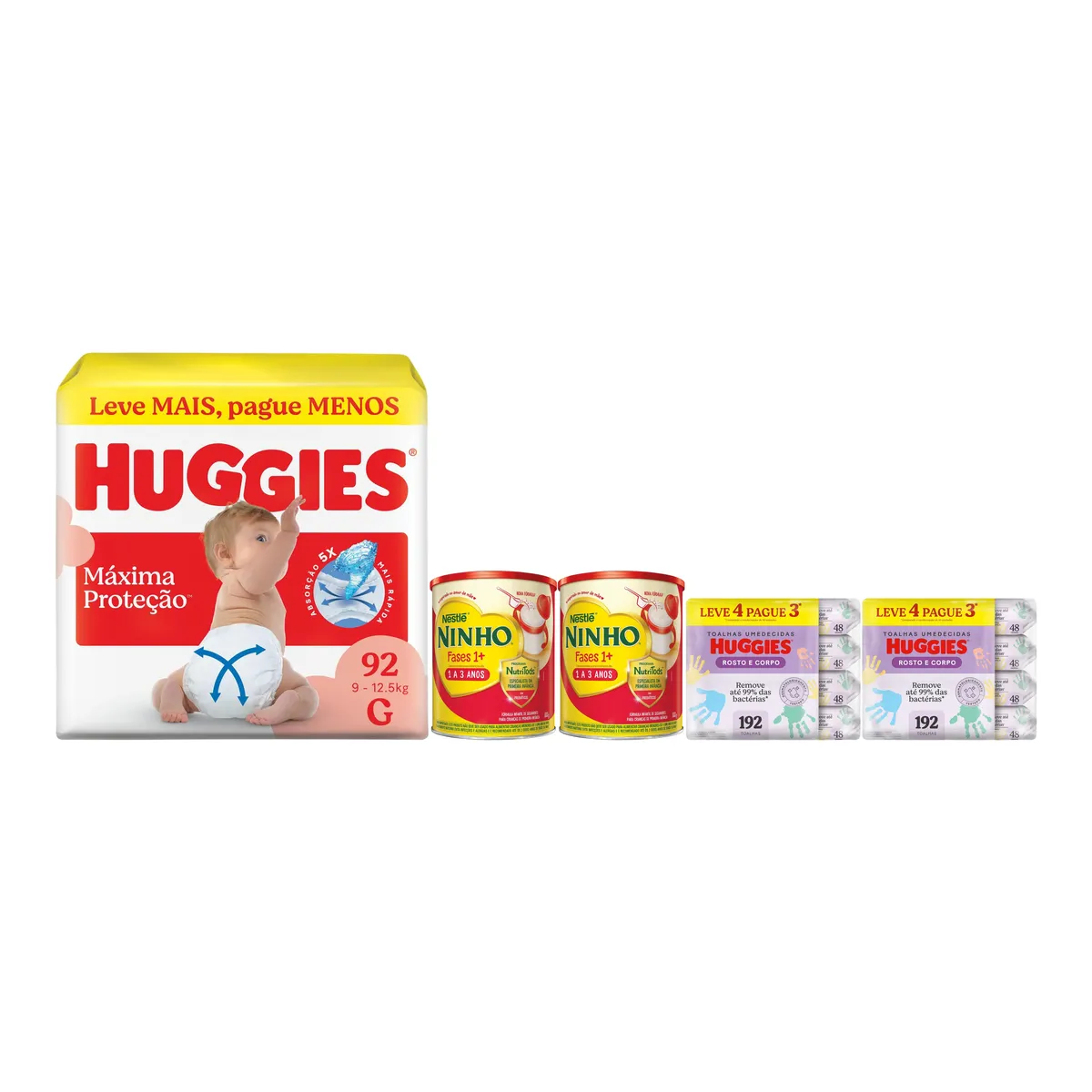 Kit Huggies Fralda Máxima Proteção G 92 unidades + Pack Lenço Umedecido Rosto e Corpo 192 unidades 2 pacotes + Fórmula Infantil Ninho Fases 1+ 800g 2 unidades