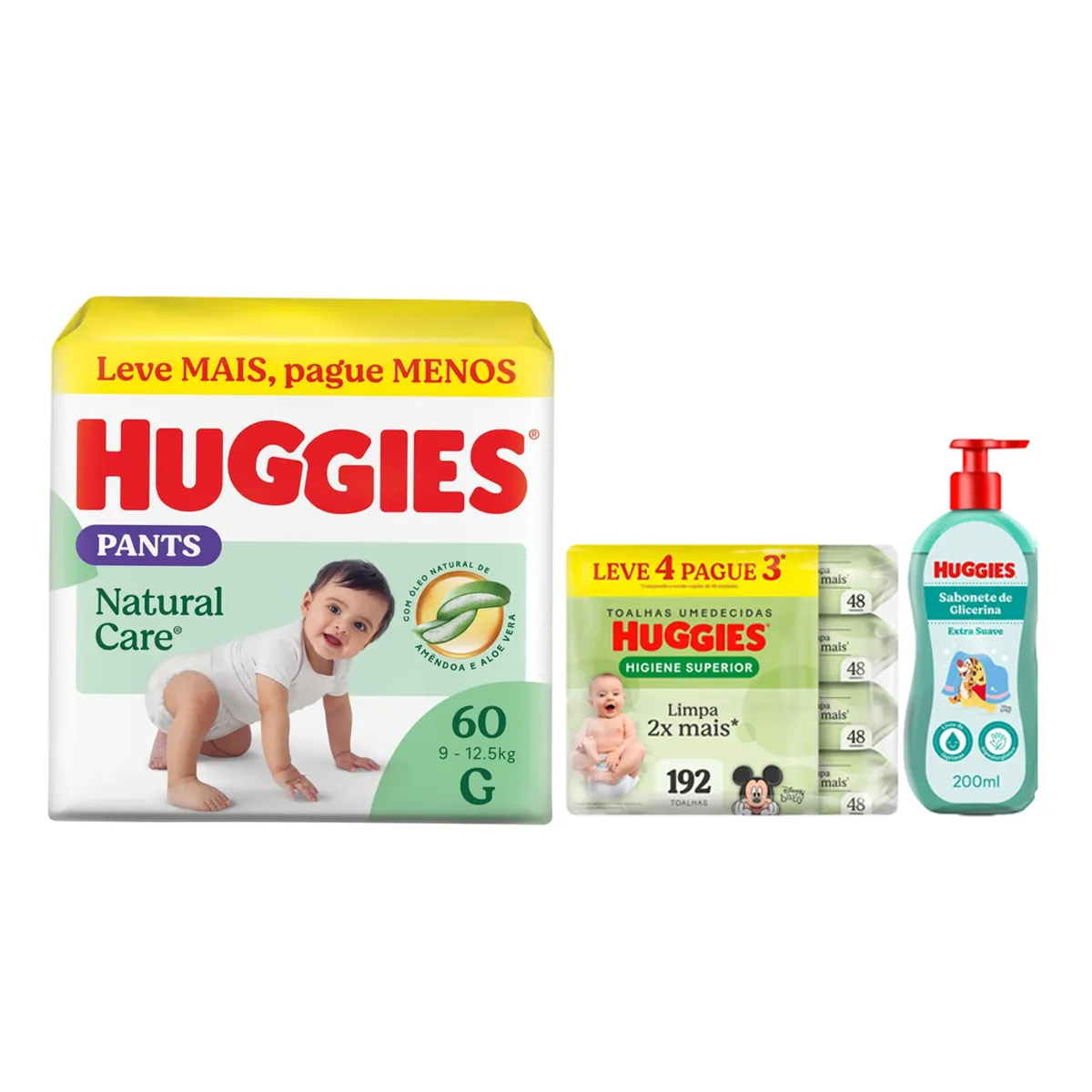 Kit Infantil Huggies Fralda Calça Natural Care Roupinha G 60 unidades + Lenço Umedecido Higiene Superior Hipoalergênico 48 unidades 4 pacotes + Sabonete Líquido Extra Suave Da Cabeça aos Pés 200ml