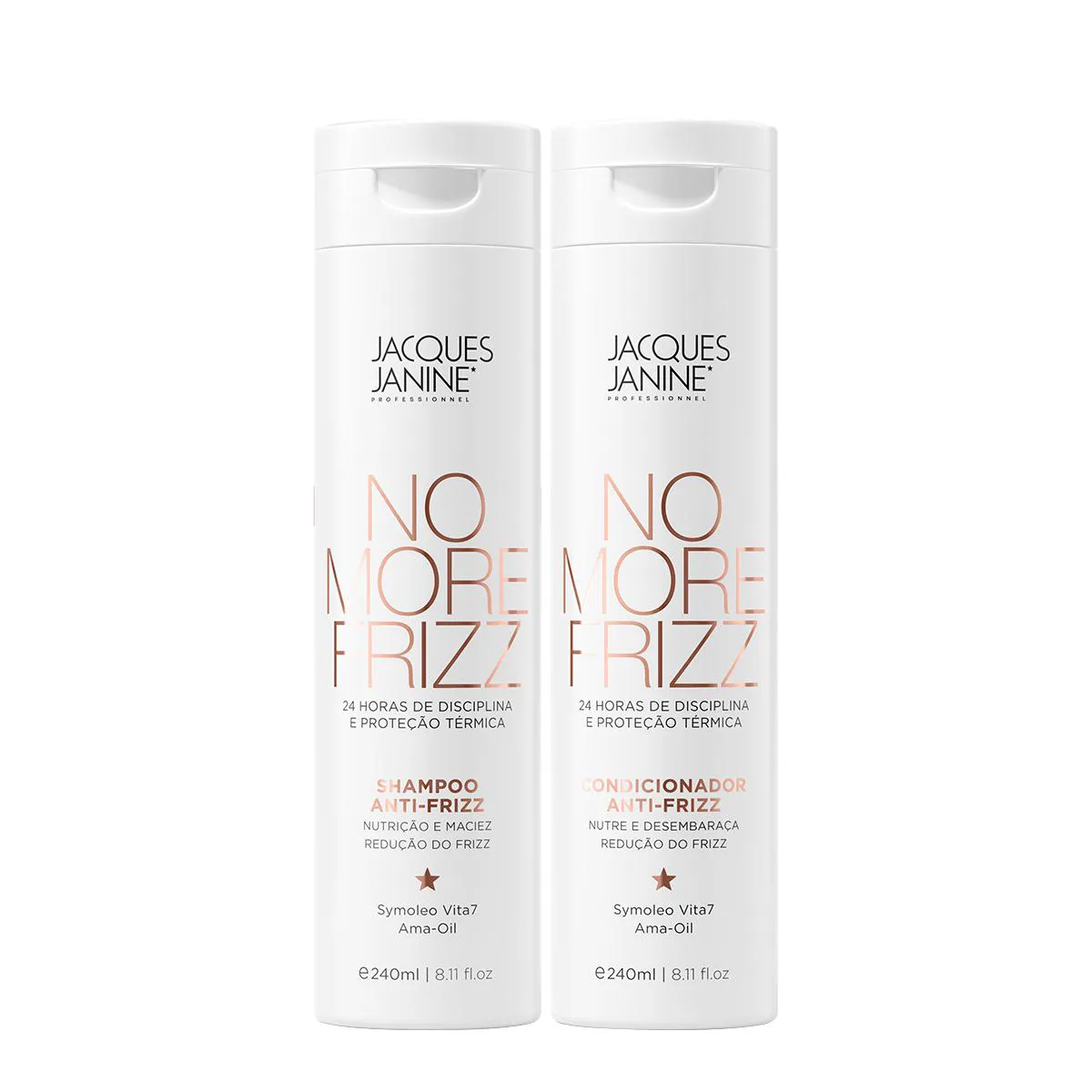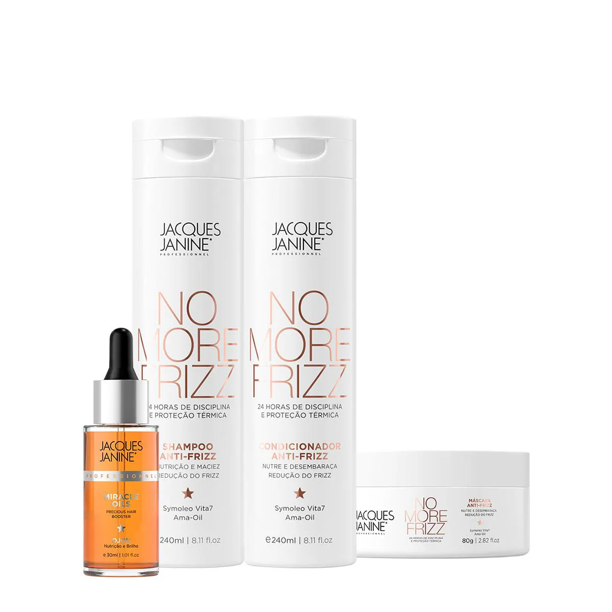 Esse Kit Contém Jacques Janine Professionnel No More Frizz – Shampoo 240ml: blindagem leve e natural que controla indisciplina dos fios desde a primeira aplicação. Sua fórmula foi especialmente desenvolvida com óleos nobres para garantir que as cutículas fiquem seladas por muito mais tempo. Forma uma película protetora contra umidade sem pesar na aparência. Jacques Janine Professionnel No More Frizz – Condicionador 240ml: é Ideal para desembaraçar qualquer tipo de cabelo. Combate o indesejável arrepiado logo na primeira aplicação, amenizando sua aparência. Com óleos nobres para garantir que as cutículas fiquem seladas por muito mais tempo. Forma uma película protetora contra umidade sem pesar na aparência. Jacques Janine Professionnel No More Frizz – Máscara 80g: para todos os tipos de cabelos. oferece hidratação profunda com fortalecimento e controle de volume por até 24 horas, logo na primeira aplicação. Proporciona uma blindagem leve e natural. Sua fórmula é enriquecida com Symoleo Vita7 e Ama-oil, que amenizam o arrepiado e prologam o efeito liso nos fios. Jacques Janine Professionnel Miracle Oils Ojon - 30ml: capilar para todos os tipos de cabelo. nutre e disciplina os fios, controlando o volume e arrepiado do cabelo. Penetra profundamente nos fios, proporcionando tratamento intensivo. Sua composição tem vitamina a e lípidios, que são responsáveis pela maciez e flexibilidade da fibra capilar. Perfeito para disciplinar os fios, o óleo é rico em aminoácidos, que controlam o volume e arrepiado. Tem ainda ação hidratante, devolvendo o brilho ao cabelo. Perfeito para potencializar seu ritual de hair care. Conselho de AplicaçãoShampoo: aplique no cabelo molhado, massageie suavemente o couro cabeludo com a ponta dos dedos até obter espuma. Enxágue e repita se necessário.