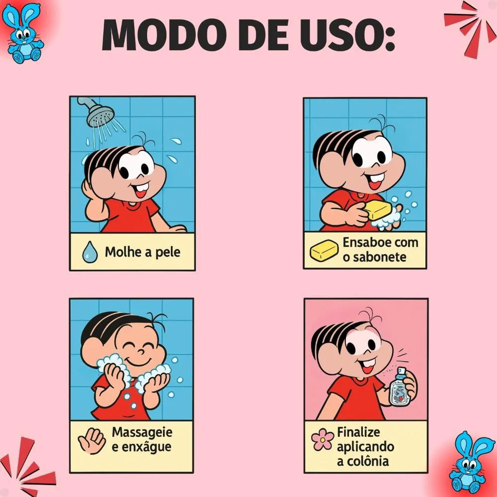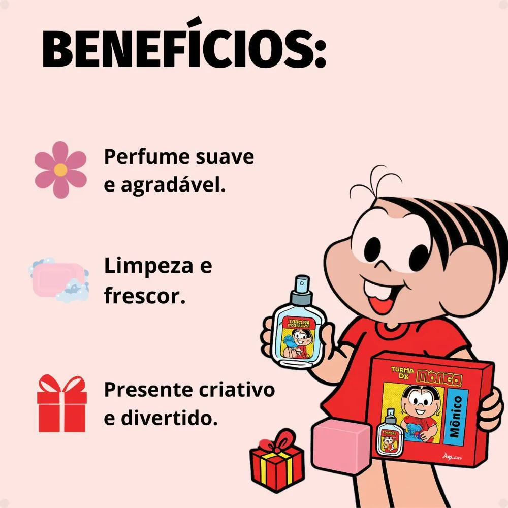 Estimula o autocuidado e a higiene pessoal de forma divertida.Proporciona uma experiência olfativa suave e agradável com a Colônia 25ml.Garante limpeza e frescor com o Sabonete 80g.Ideal para presentear e encantar os fãs da Turma da Mônica.Diferenciais do Produto